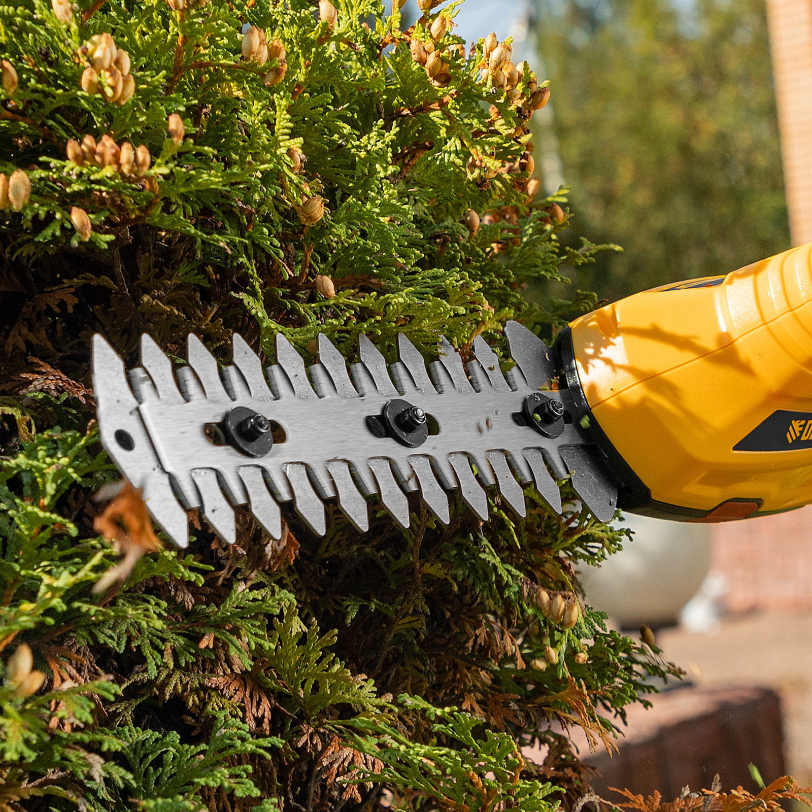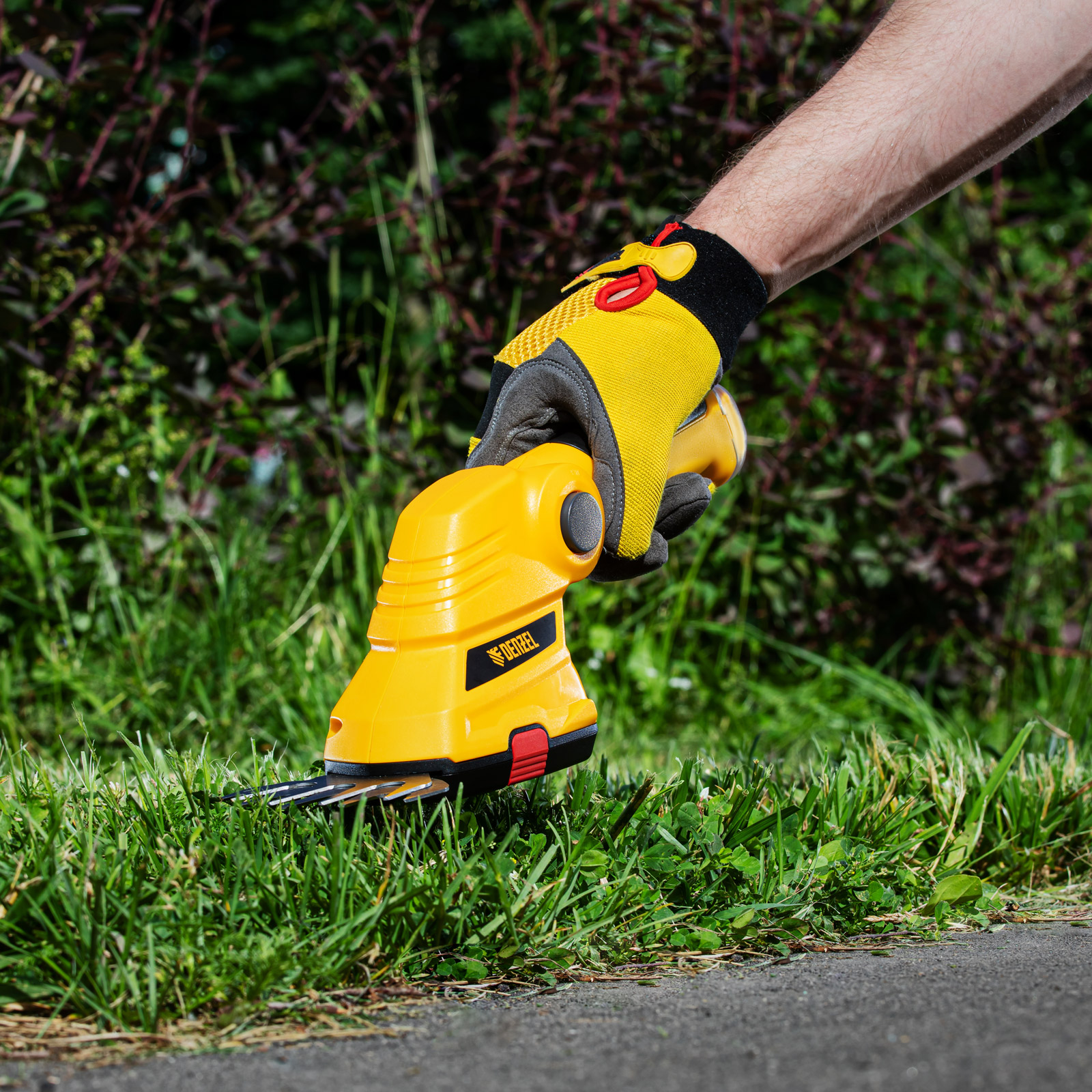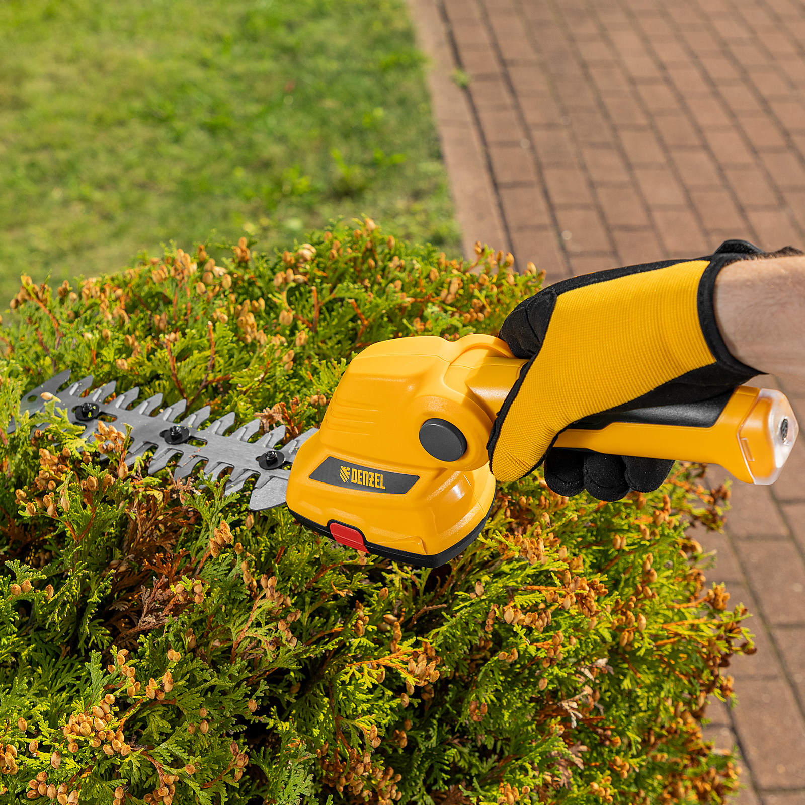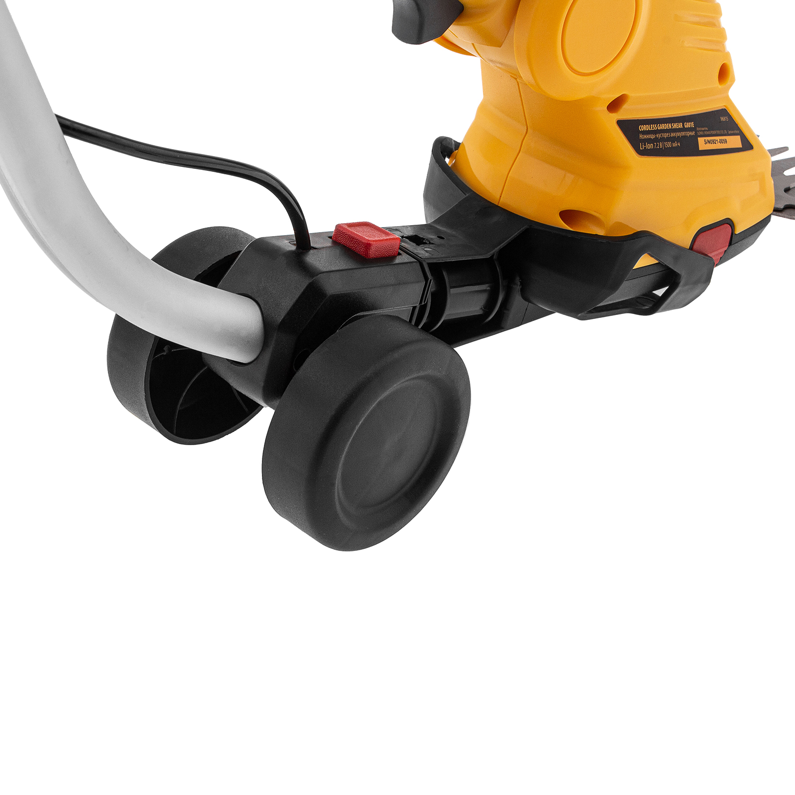 Аккумуляторные ножницы-кусторез Denzel G801E 968157 с телескопической штангой, с Li-Ion батареей емкостью 1,5 Ач и напряжением 7,2 В, используются для ухода за садовым участком. Поставляются с двумя насадками: для подрезания газонной травы и для обрезки кустов и тонких веток деревьев. Небольшой вес 1,1 кг и съемная штанга с колесным блоком обеспечивают комфортное использование ножниц-кустореза.