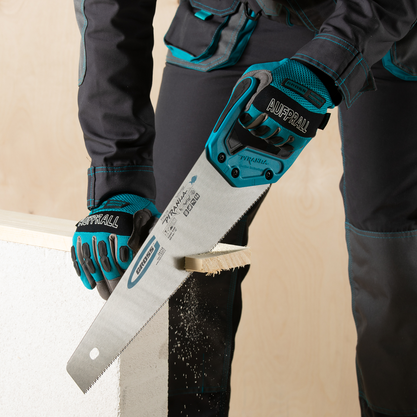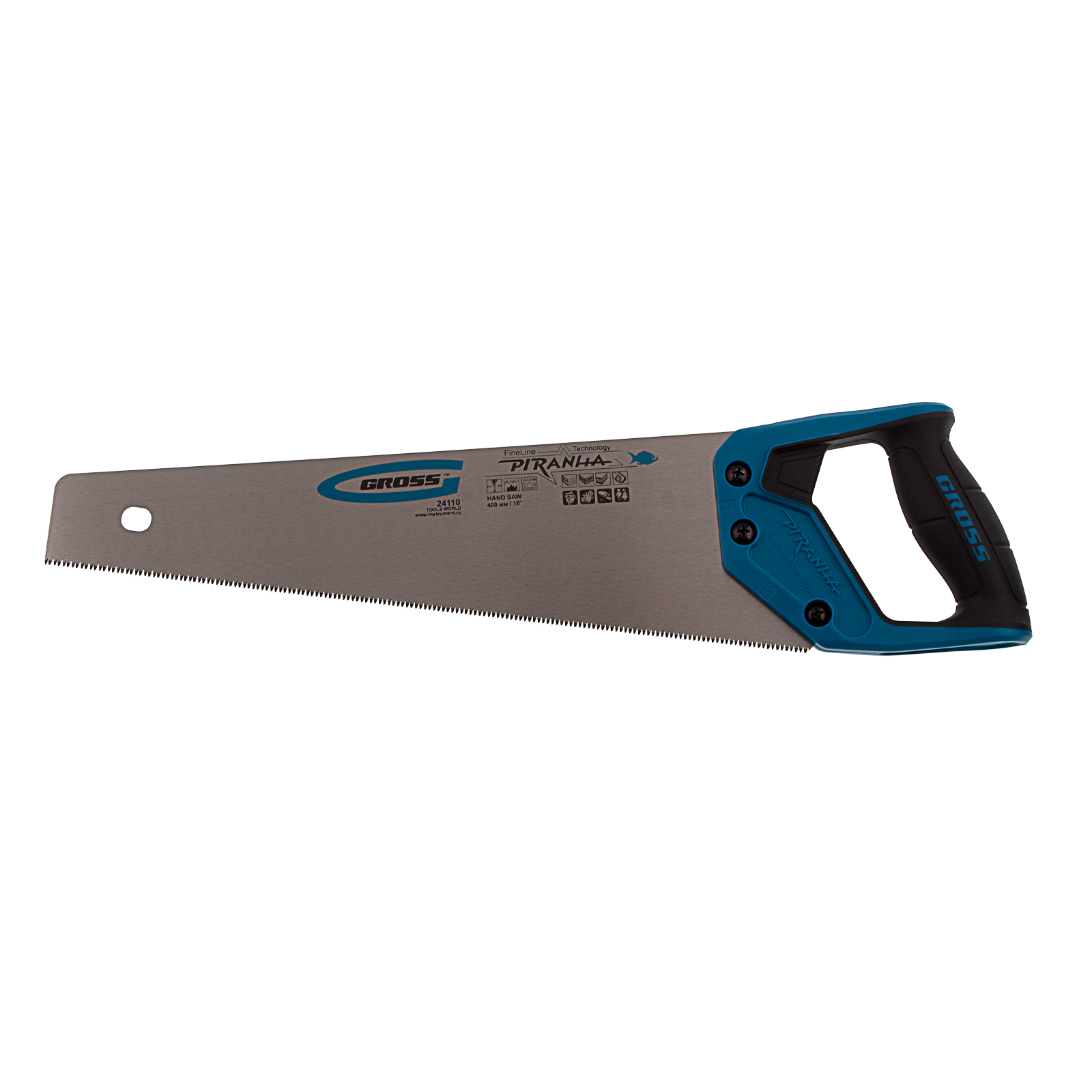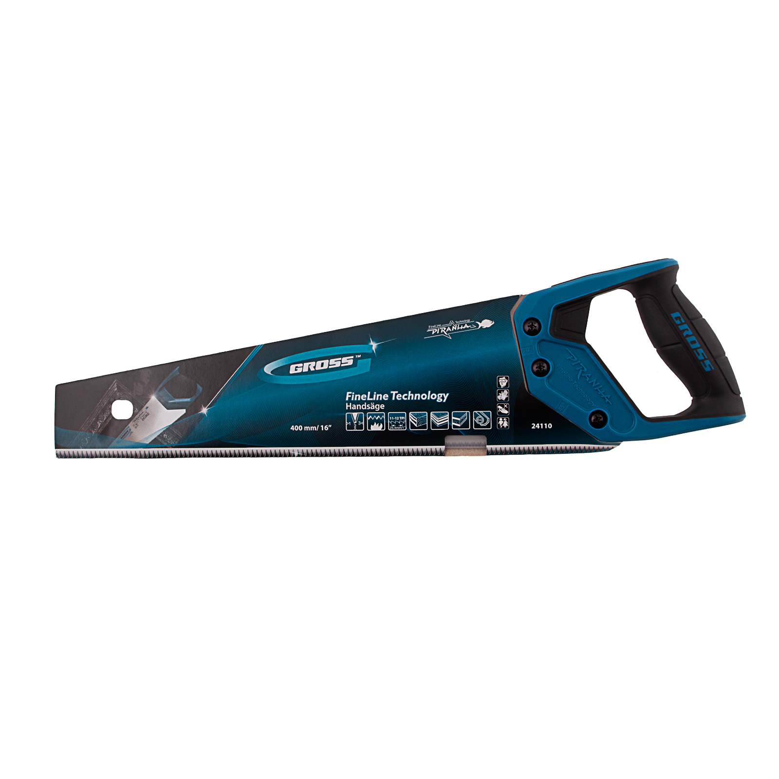 Ножовка по дереву Gross PIRANHA 24110 с полотном длиной 400 мм, калеными зубьями с 3D-заточкой и шагом 11-12 TPI, 2-компонентной рукояткой, предназначена для распиловки заготовок из древесины, ДСП, ДВП, МДФ и ламината, а также из пластических материалов, таких как пенополистирол и полиуретан. Может производить продольный и поперечный распил. Мелкие зубья с шагом 11-12 TPI позволяют выполнять точный и чистый рез. Ножовка обладает высокой производительностью благодаря трехгранной заточке зубьев. Инструмент используется в столярном деле.