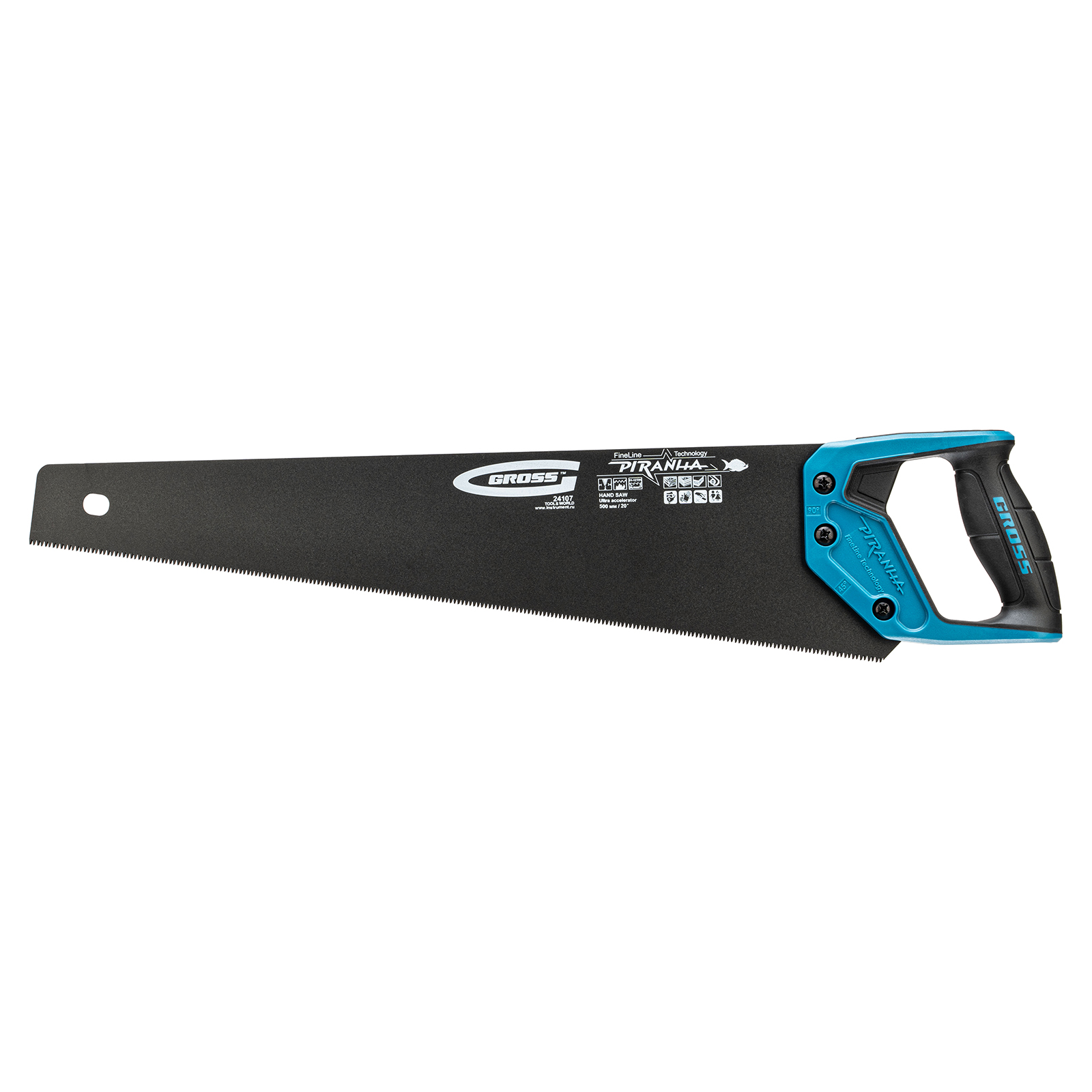 Ножовка по дереву Gross PIRANHA 24107 с полотном длиной 500 мм, калеными зубьями с 3D-заточкой и шагом 11-12 TPI, с тефлоновым покрытием полотна и 2-компонентной рукояткой, используется для продольного и поперечного распиливания древесины различных пород, МДФ, ДСП, ДВП, ламината, а также пенополистирола, полиуретана и других синтетических материалов. Рабочая часть состоит из мелких зубьев с шагом 2-2,3 мм, что позволяет получить ровный и чистый рез. Трехгранная заточка зубьев увеличивает производительность инструмента без потери качества распиловки. Ножовка предназначена для столярных работ.