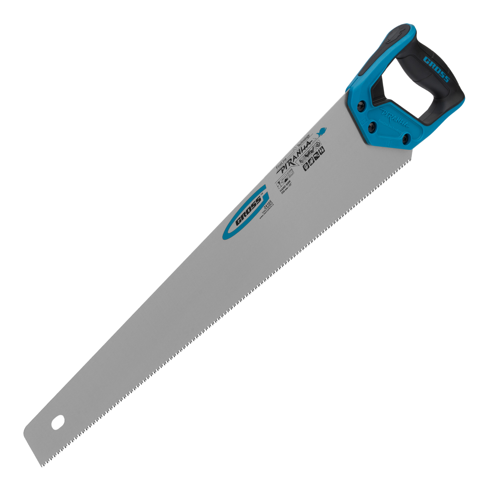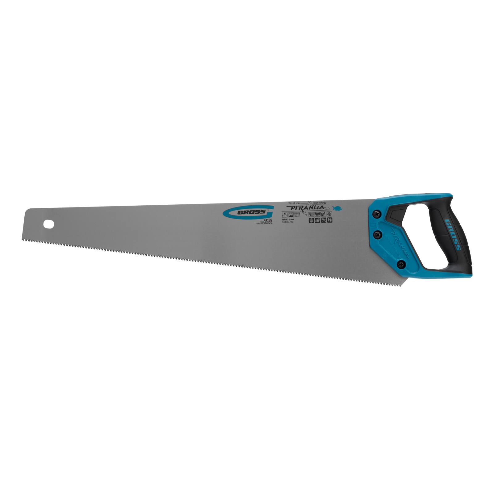 Ножовка по дереву Gross PIRANHA 24105 с полотном длиной 550 мм, калеными зубьями с 3D-заточкой и шагом 11-12 TPI, с двухкомпонентной рукояткой, предназначена для распиловки заготовок из древесины, ДСП, ДВП, МДФ и ламината, а также из пластических материалов, таких как пенополистирол и полиуретан. Может производить продольный и поперечный распил. Мелкие зубья с шагом 11-12 TPI позволяют выполнять точный и чистый рез. Ножовка обладает высокой производительностью благодаря трехгранной заточке зубьев. Инструмент используется в столярном деле.