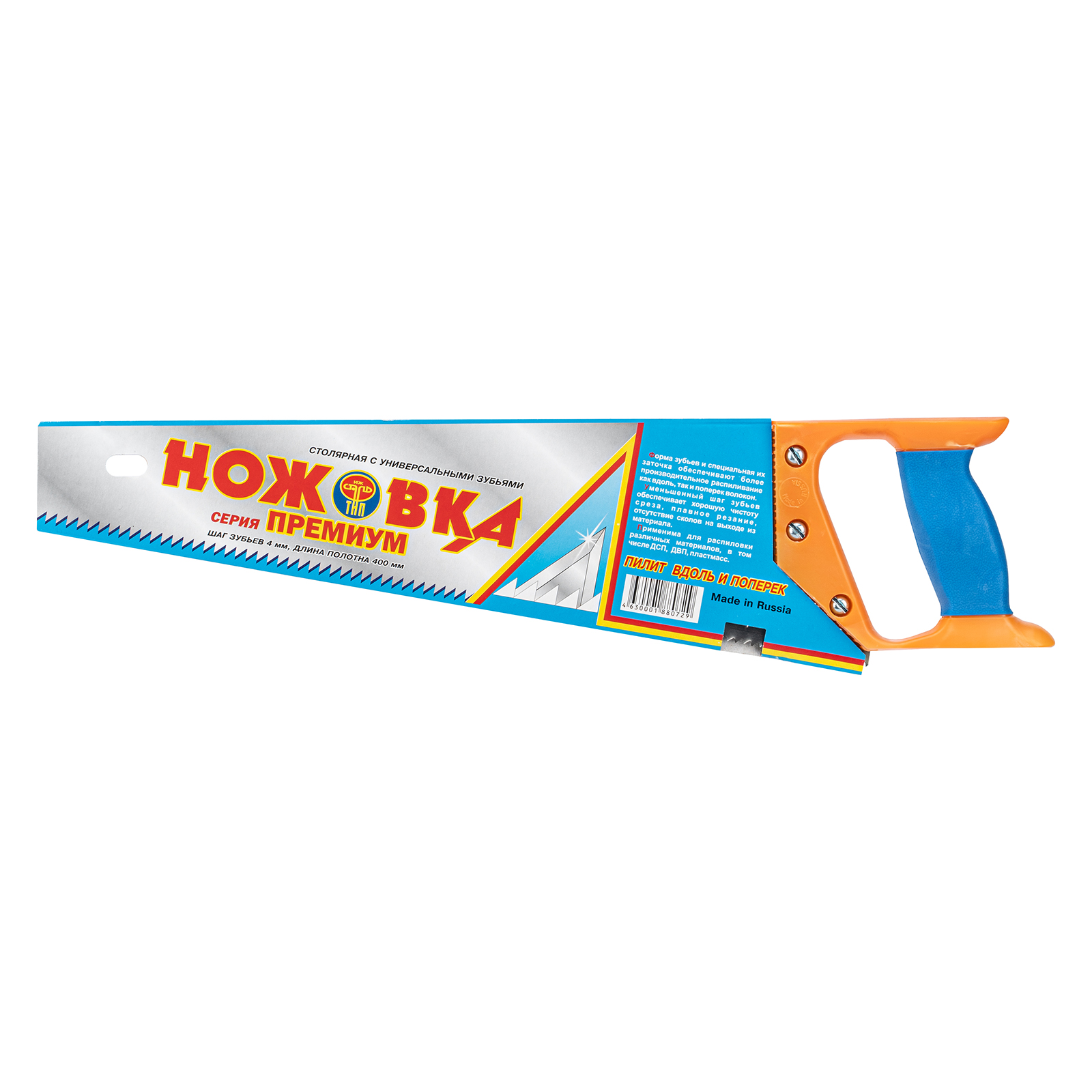 Ножовка по дереву 23163 с длиной полотна 400 мм и пластиковой рукояткой — режущий инструмент, шаг зубьев которого составляет 4 мм. Применяется для продольно-поперечного пиления древесины. Пилит в направлении от себя и на себя. Крупные зубья обеспечивают быстрый рез. Если режущая кромка затупится, ее можно заточить. Пила будет полезна столяру и плотнику, пригодится также дома или на даче.