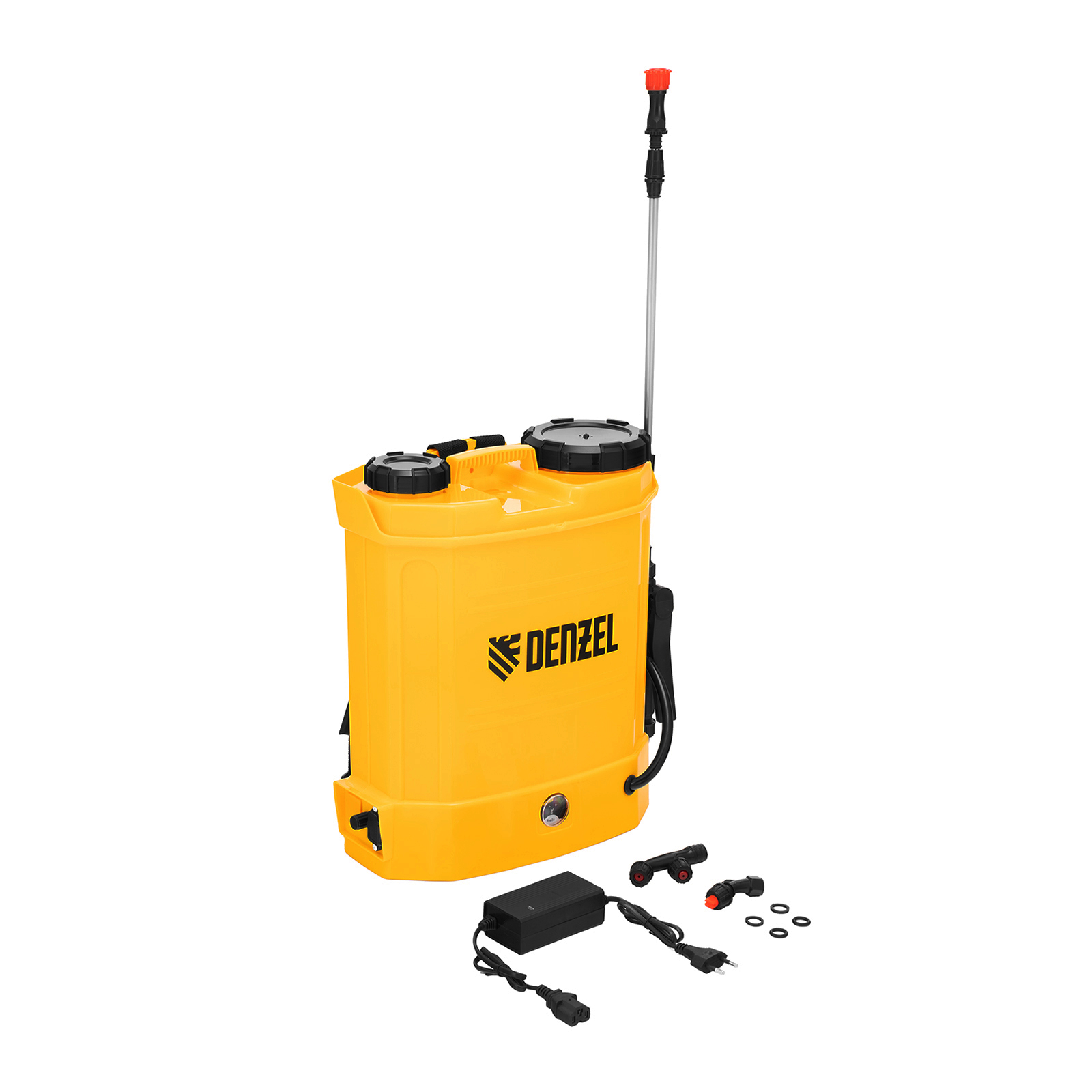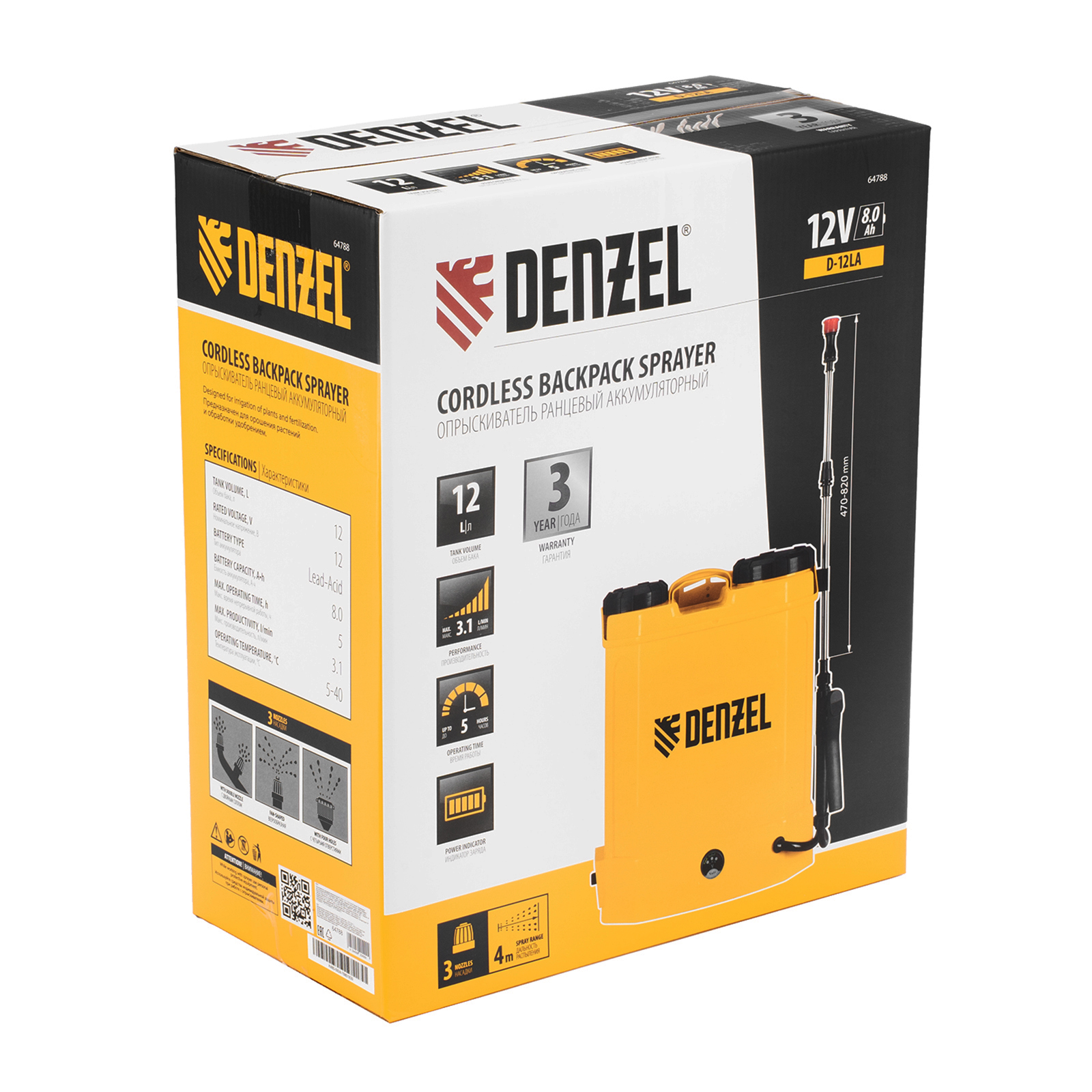 Ранцевый аккумуляторный опрыскиватель Denzel D-12LA 64788 с баком объемом 12 л и батареей на 12 В, емкостью 8 Ач, предназначен для распыления воды или инсектицидов. Используется для ухода за растениями, дезинфекции помещения, мытья окон и фасадов. Длина штанги регулируется в диапазоне 470-820 мм, а максимальная дальность распыления составляет 4 м, что облегчает обработку труднодоступных мест.