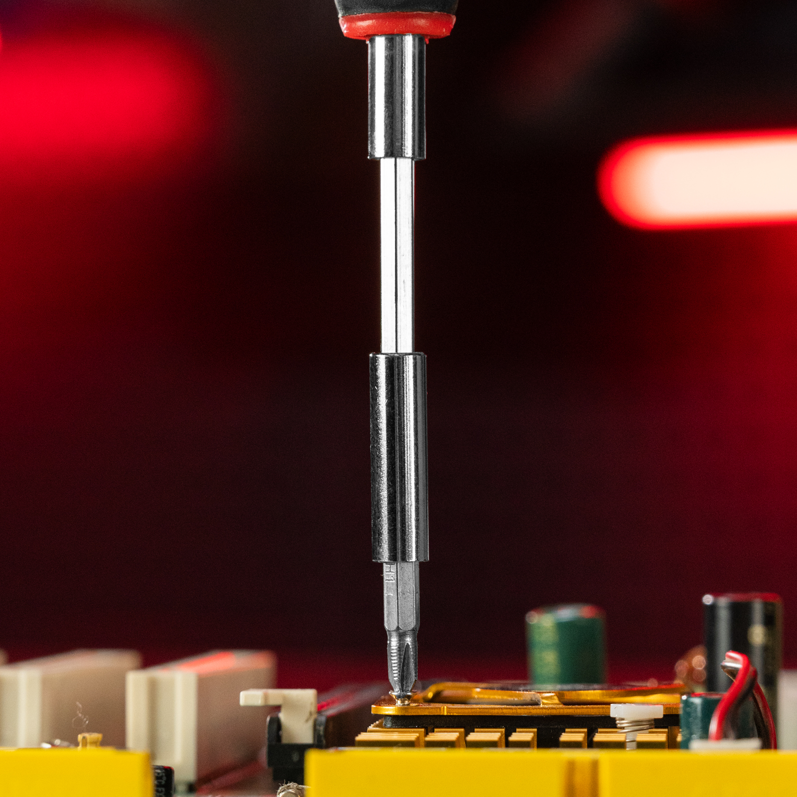- Намагниченный наконечник бит — отвертку с крепежом можно направлять одной рукой, а другой придерживать закрепляемую деталь.