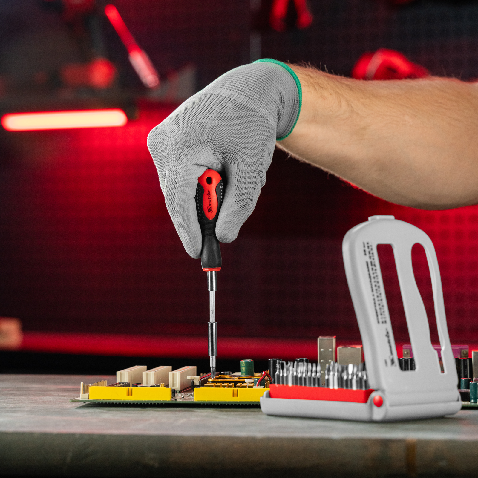 Отвертка для точных работ Matrix Fusion 11584 с с насадками, — это набор из 22 предметов в пластиковом пенале, который используется для ремонта электротехники, очков, мобильных телефонов, ноутбуков и т.д. 20 бит для точных работ и битодержатель обеспечивают эффективное решение поставленных задач. Набор пригодится профессиональному мастеру.