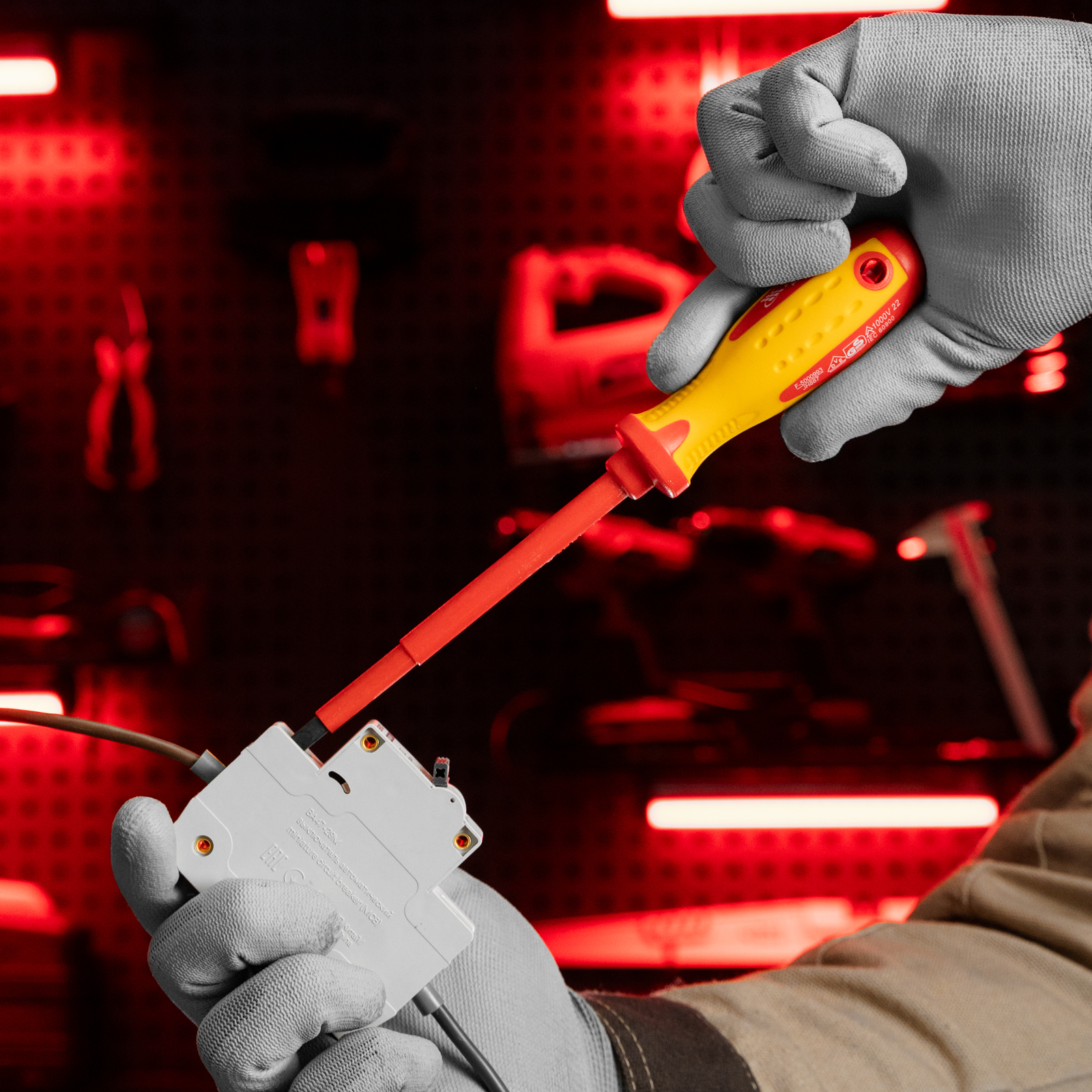 Отвертка Matrix Insulated 12918, SL5,5 x 125 мм, из стали CrMo, с двухкомпонентной рукояткой до 1000 В, используется при проведении ремонтных с крепежом типа Slotted «минус». Благодаря диэлектрическому покрытию она выдерживает напряжение до 1000 В, поэтому оптимально подходит для настройки электрооборудования, установки розеток и др. Важно — техника безопасности запрещает работать под напряжением!