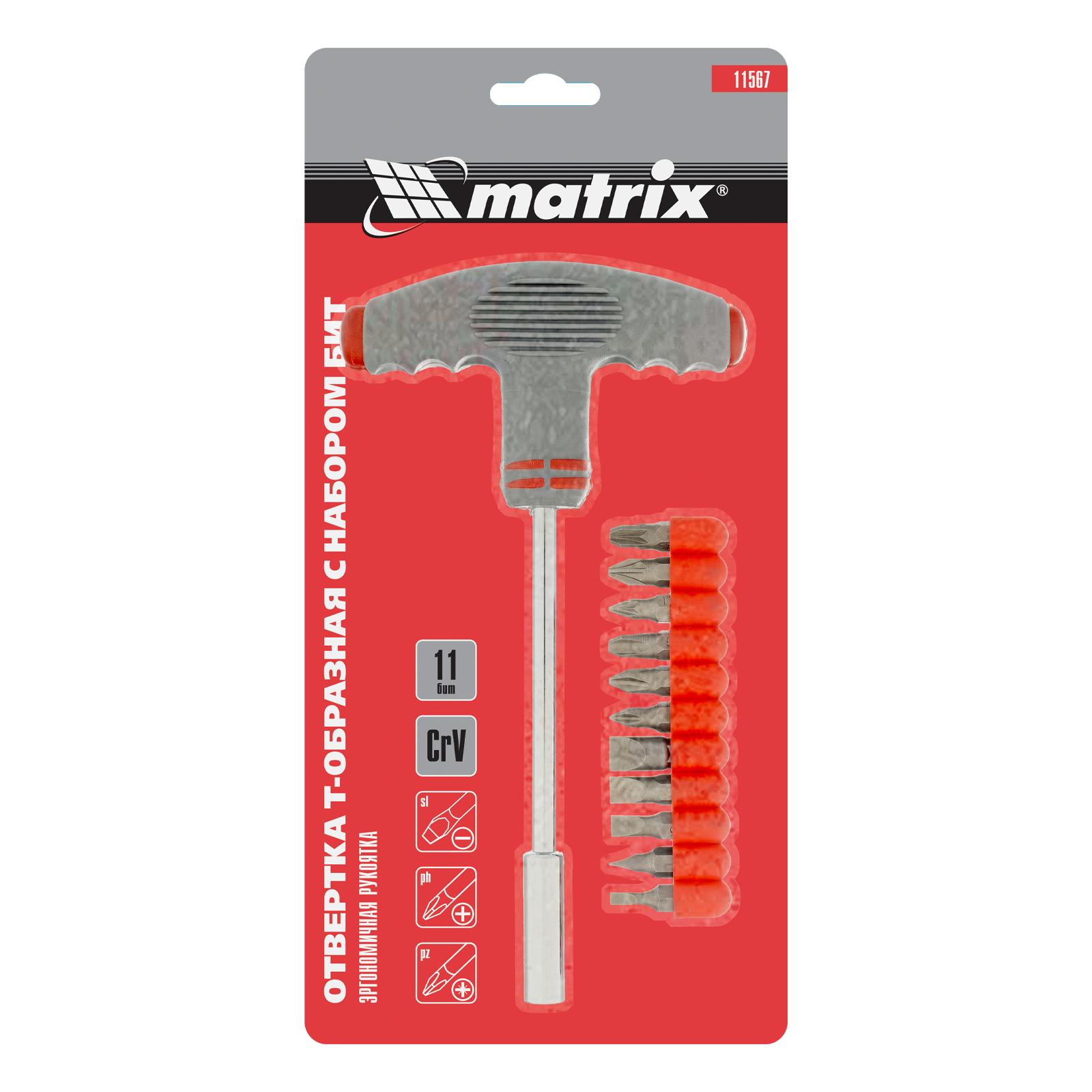 Отвертка с Т-образной эргономичной ручкой и набором бит, 11 шт, CrV Matrix