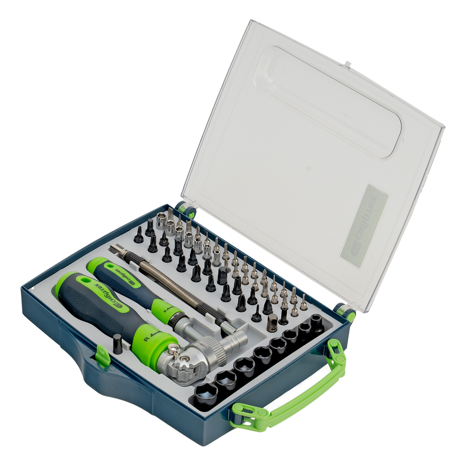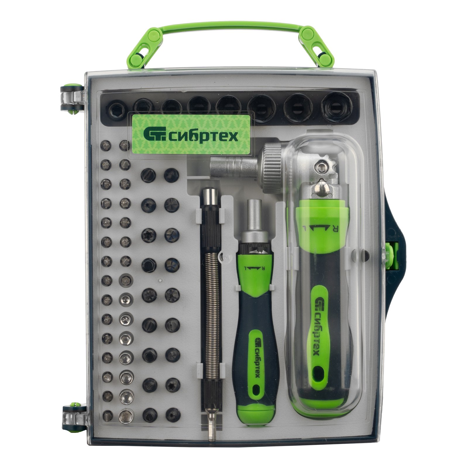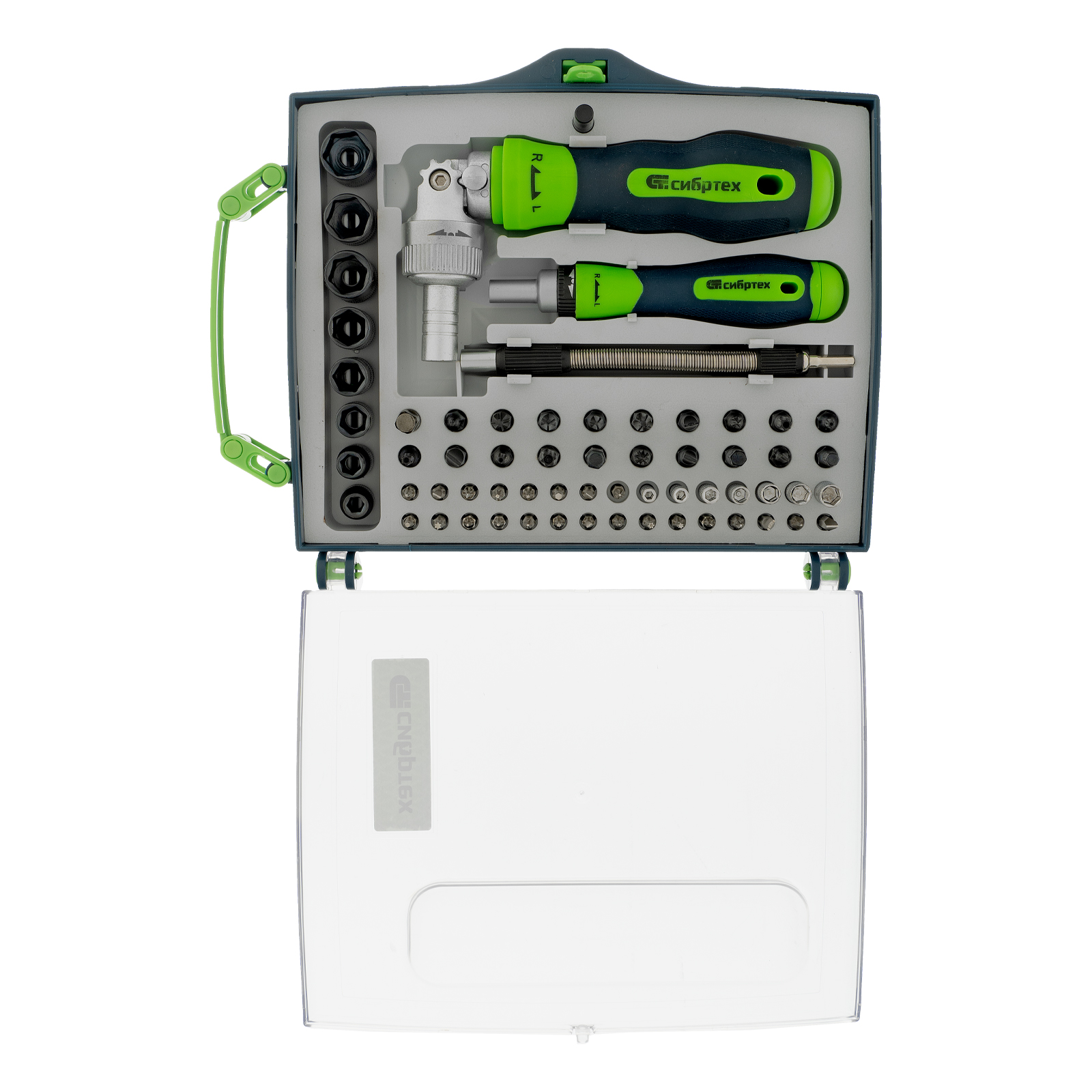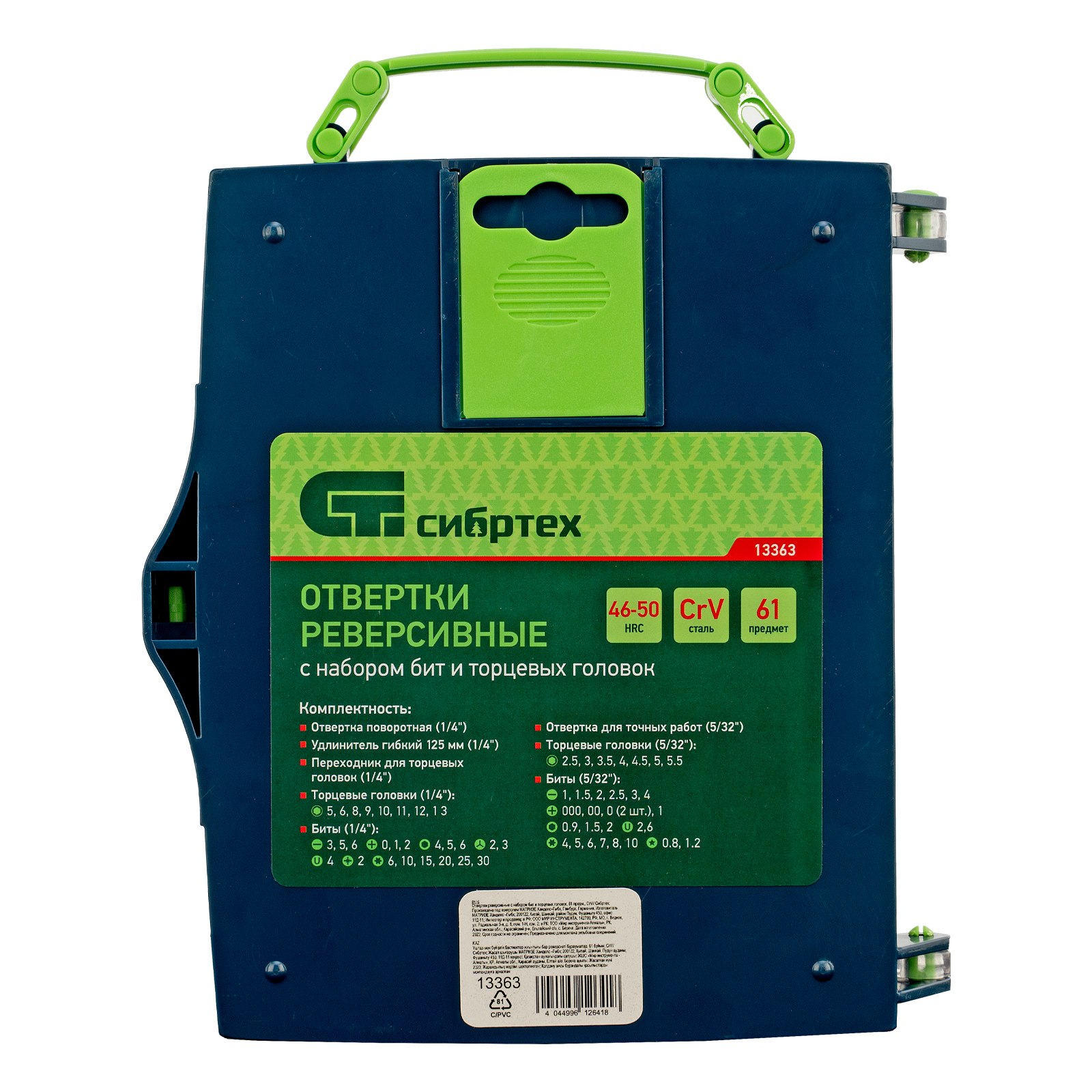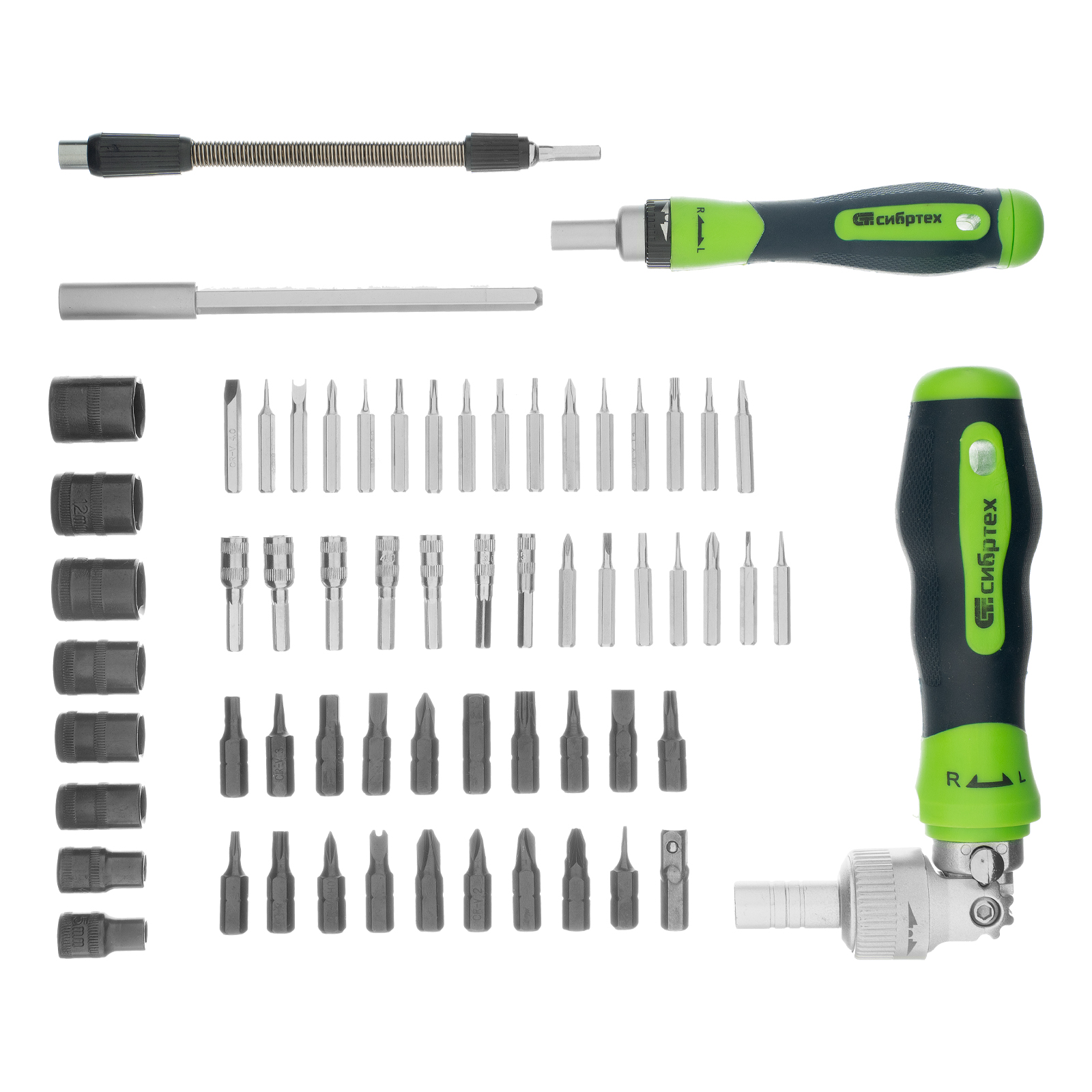Отвертки реверсивные с набором бит, торцевых головок, 61 предмет, CrV Сибртех