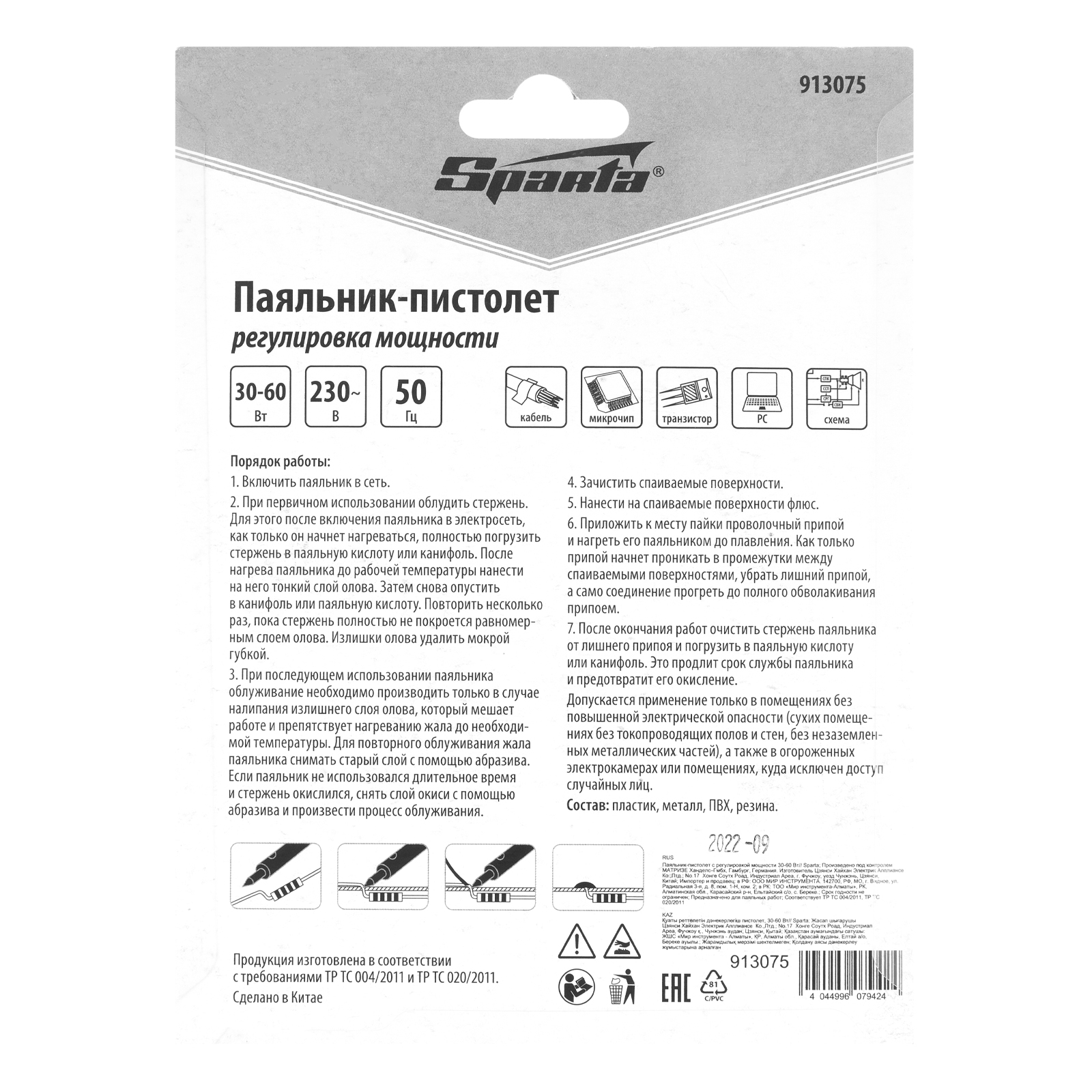 Паяльник-пистолет с регулировкой мощности 30-60 Вт, 220 В Sparta