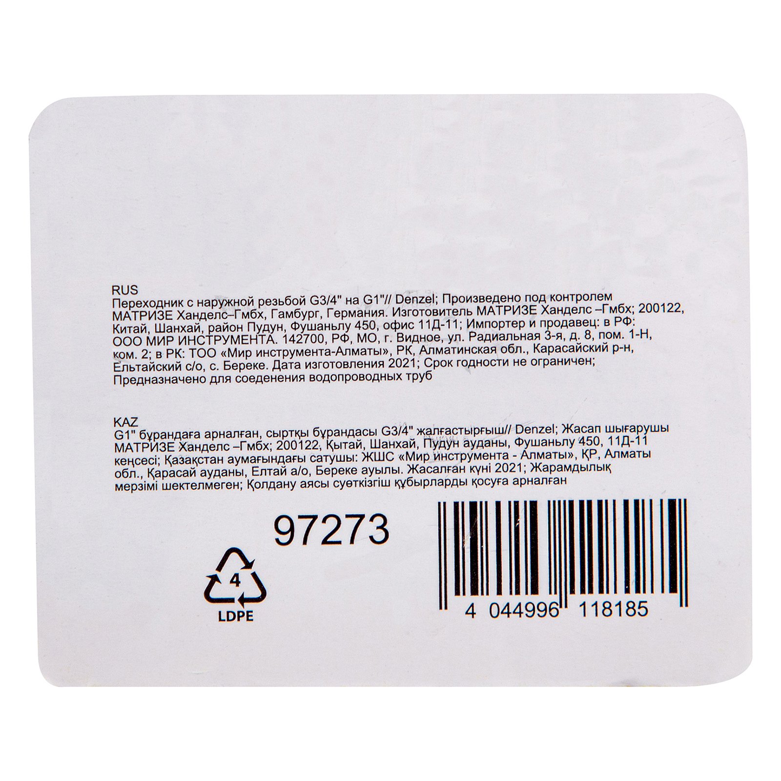 Переходник Denzel 97273 с наружной резьбой используется для быстрого подключения шлангов с резьбой G3/4 и G1 к насосному оборудованию. Пригодится для организации системы водоснабжения на дачном участке.
