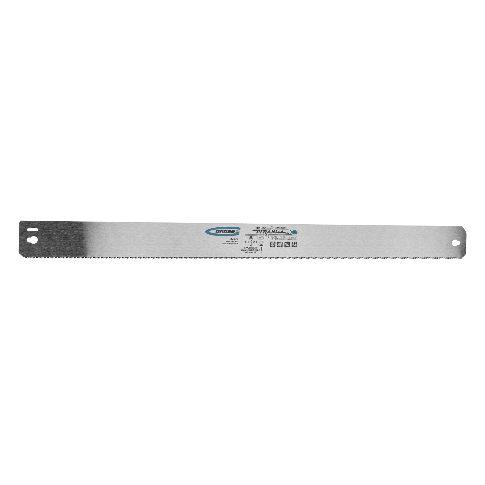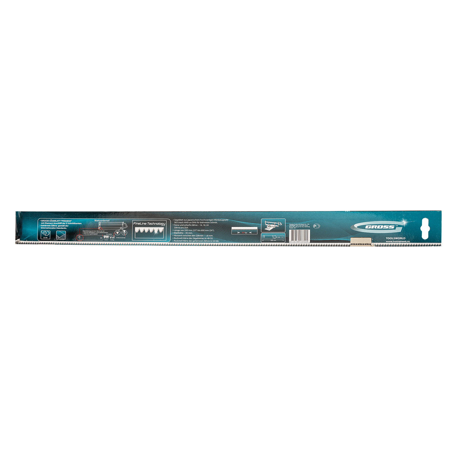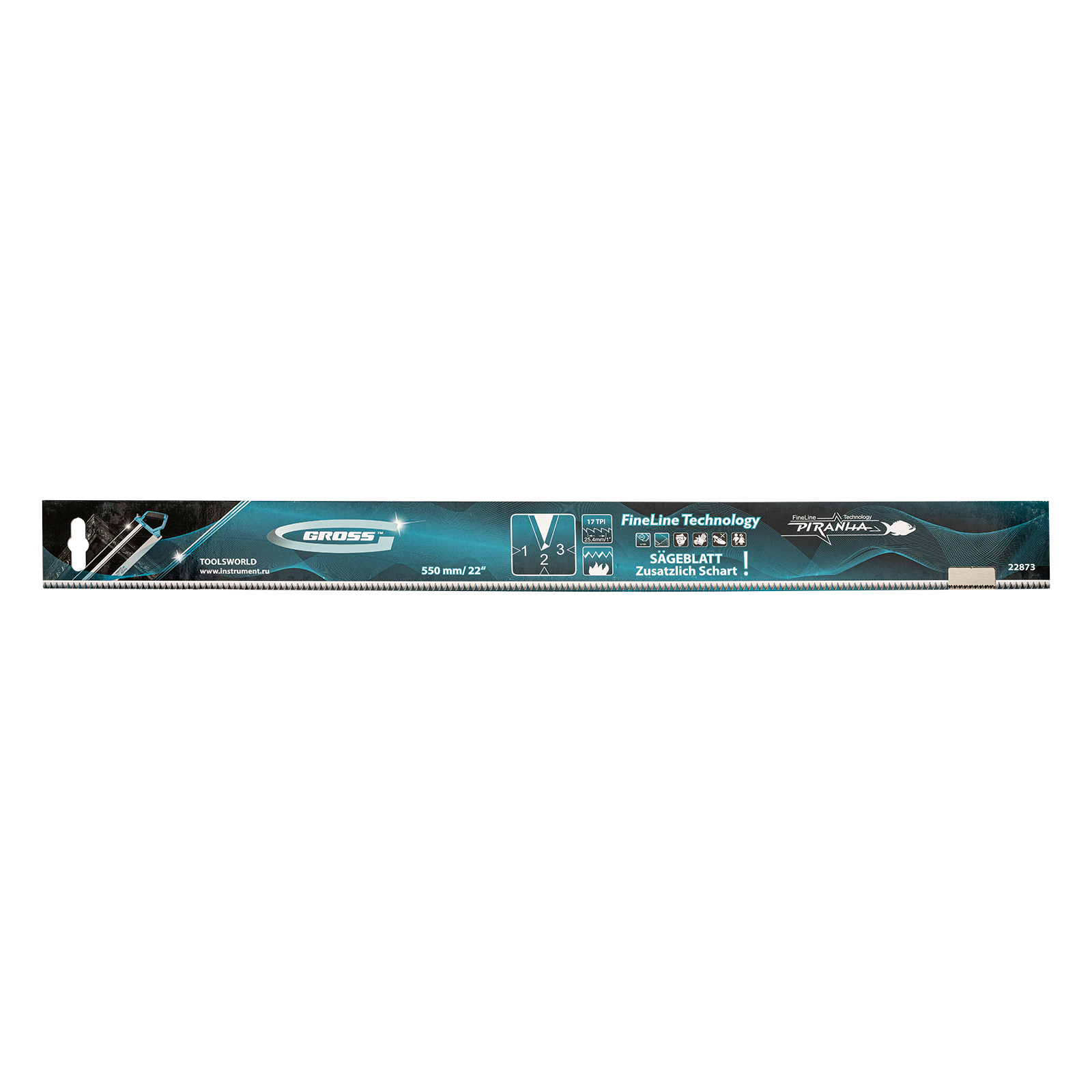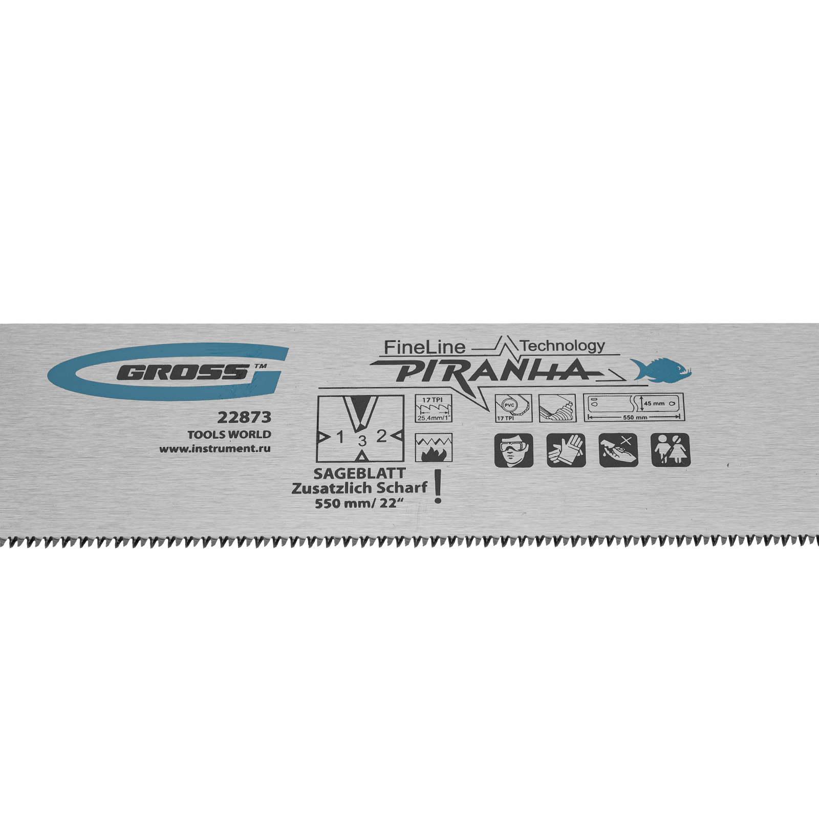 Пильное полотно Gross «PIRANHA» 22873 длиной 550 мм, с каленым зубом с 3D-заточкой, 18 TPI — режущий элемент для прецизионного стусла, применяемый для распила под углом заготовок из дерева, мягкого металла и пластика. Мелкие зубья с шагом 18 TPI позволяют получить точный и чистый рез. Полотно используется для пиления плинтусов, реек, дверных наличников и других деталей.