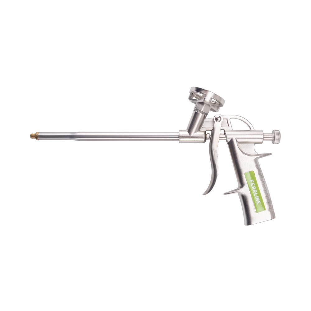 Пистолет для монтажной пены FerrLine FM-12. Предназначен для проведения работ с профессиональной монтажной пеной при установке дверей, окон, различных строительных конструкций. Прочная и крепкая металлическая конструкция гарантирует эксплуатационную надежность и долговечность, а удобная и эргономичная рукоятка снижает усилие и нагрузку при нажатии в ходе выполнения работы. Винт регулировки подачи пены обеспечивает более точное и аккуратное нанесение. Цельнометаллический корпус придает дополнительную надежность и облегчает регулярную чистку инструмента от пены, которую всегда нужно производить после его использования.