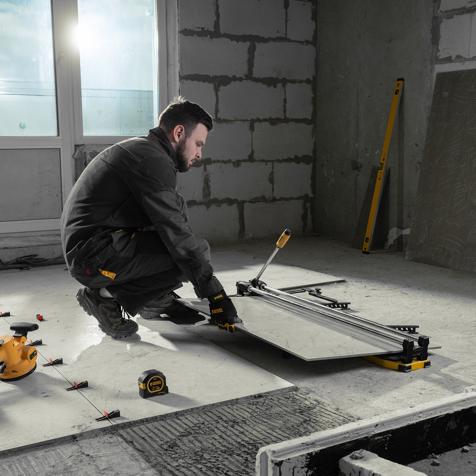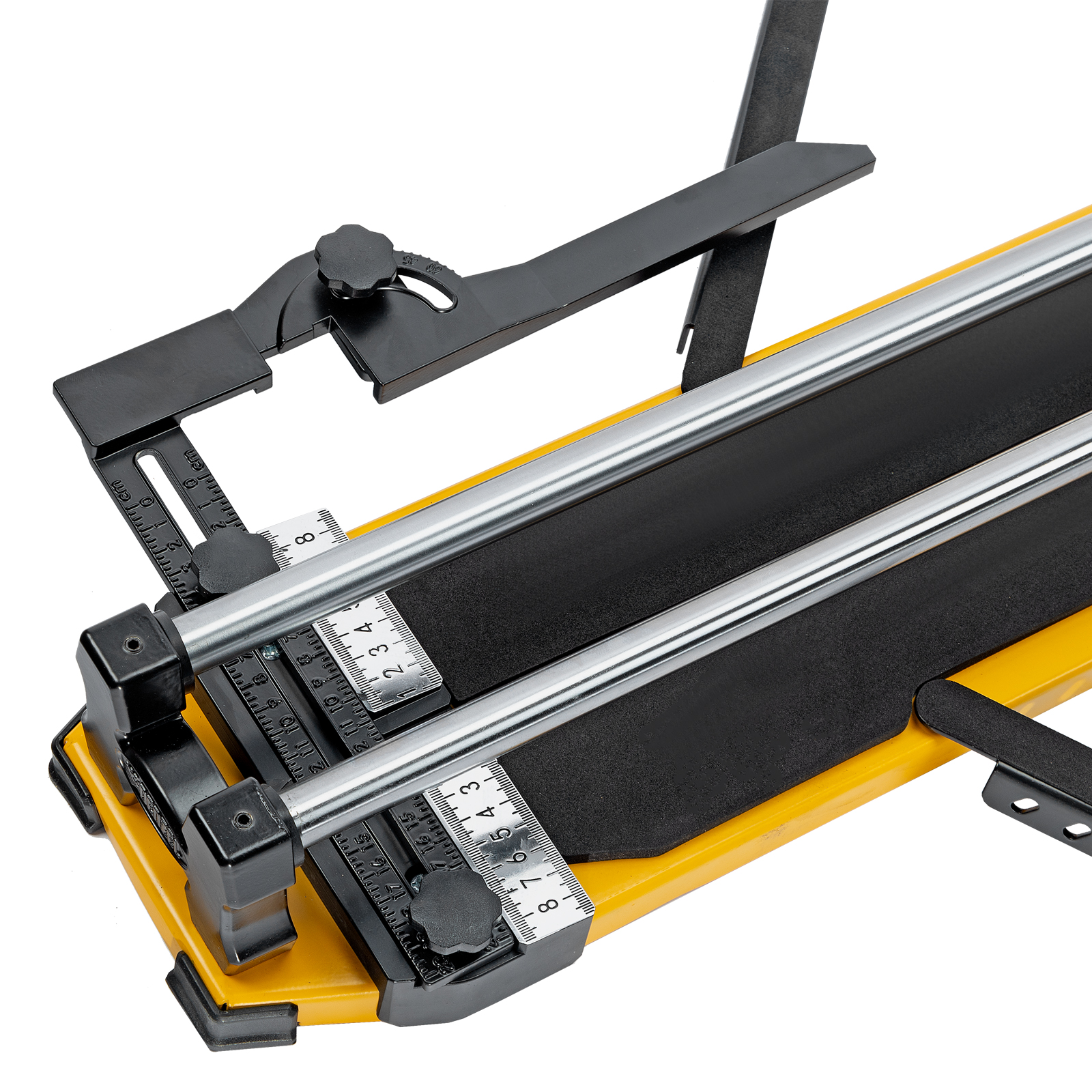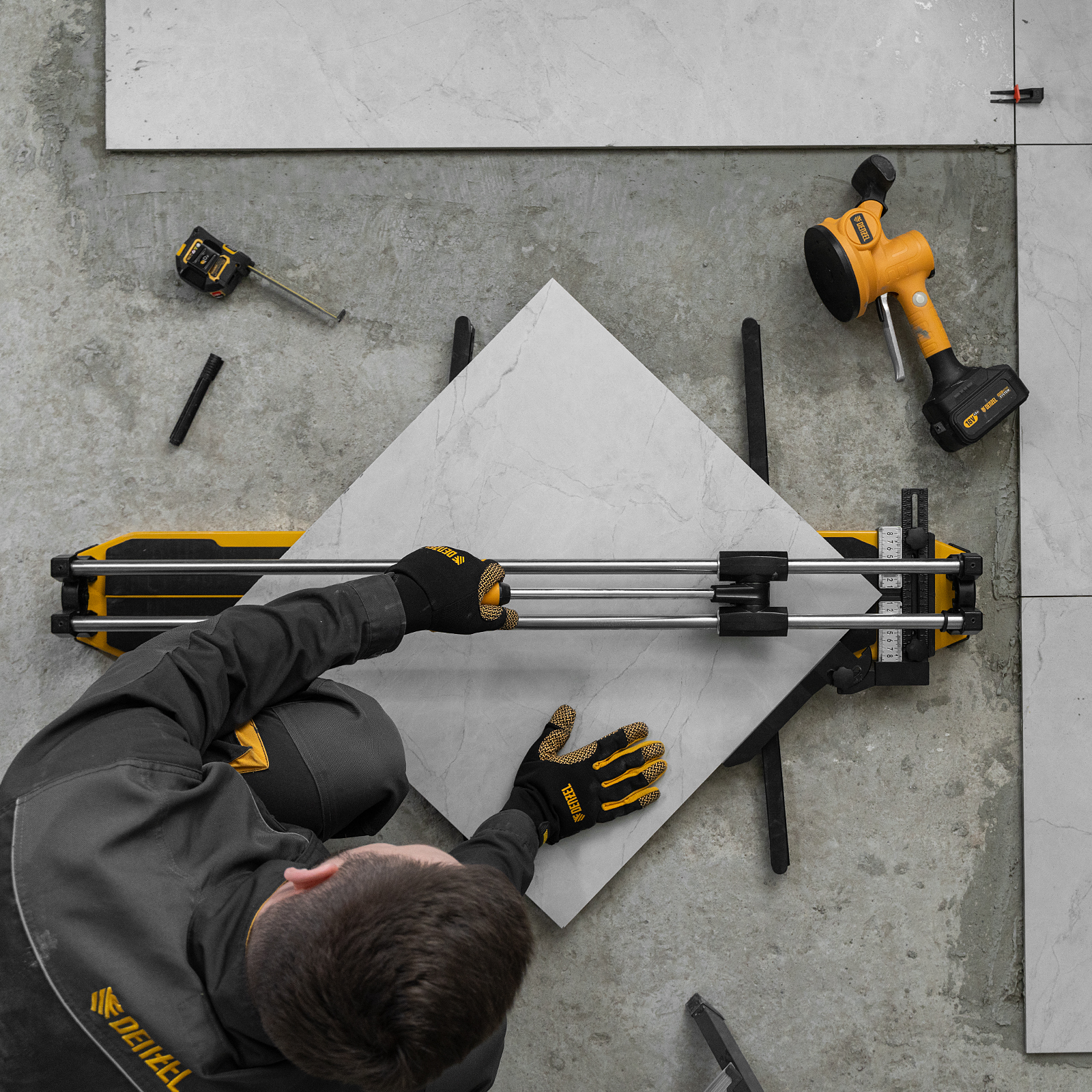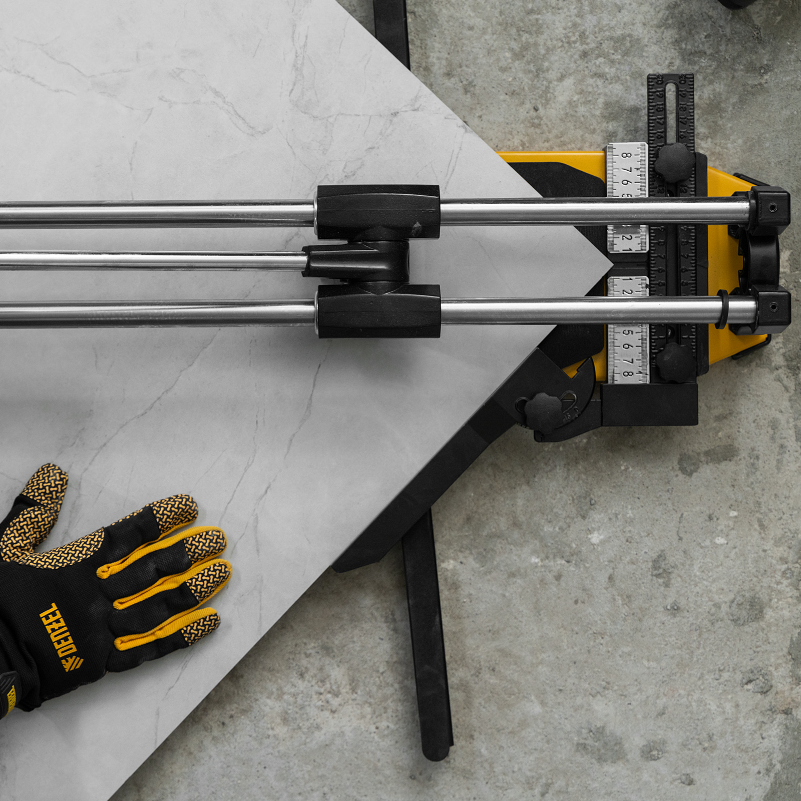 - Удобная работа — благодаря противоскользящим накладкам плиткорез не смещается даже на гладких поверхностях.