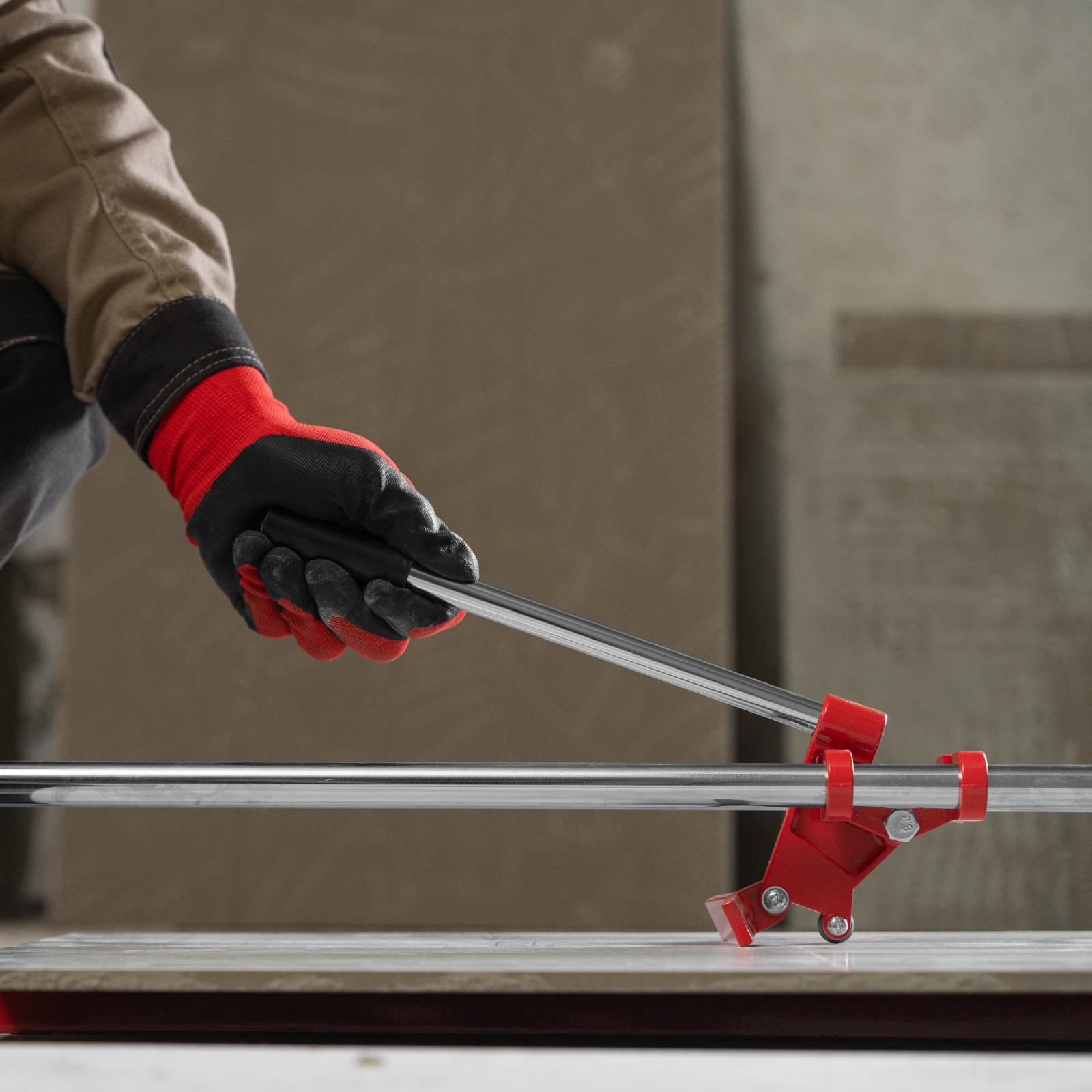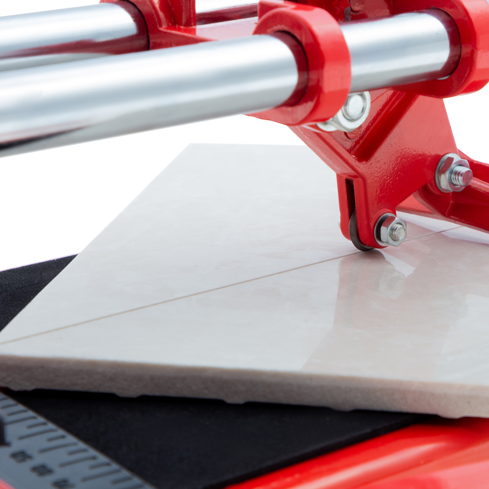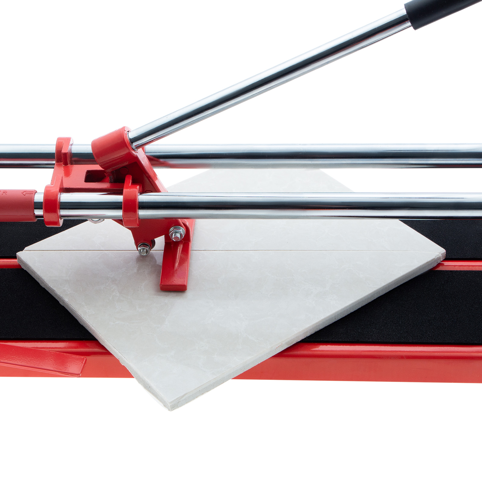 - Неподвижность плитки — плиткорез с широким основанием снабжен мягкими амортизирующими накладками, угольник-угломер дополнительно фиксирует заготовку.
