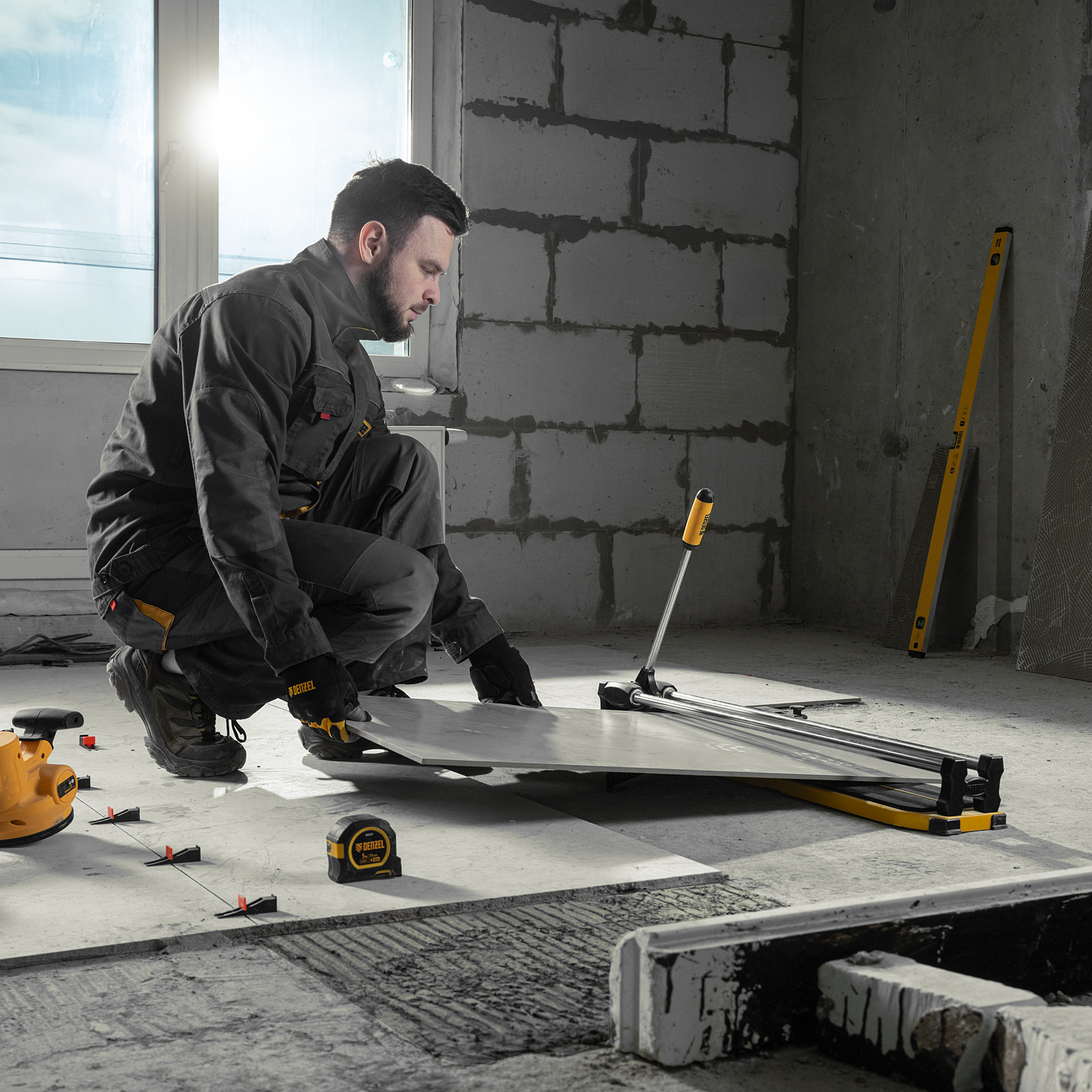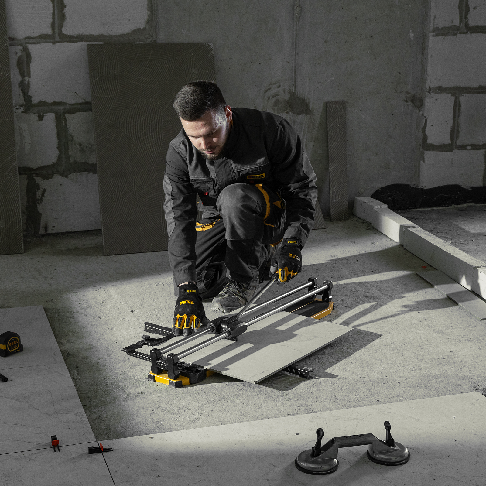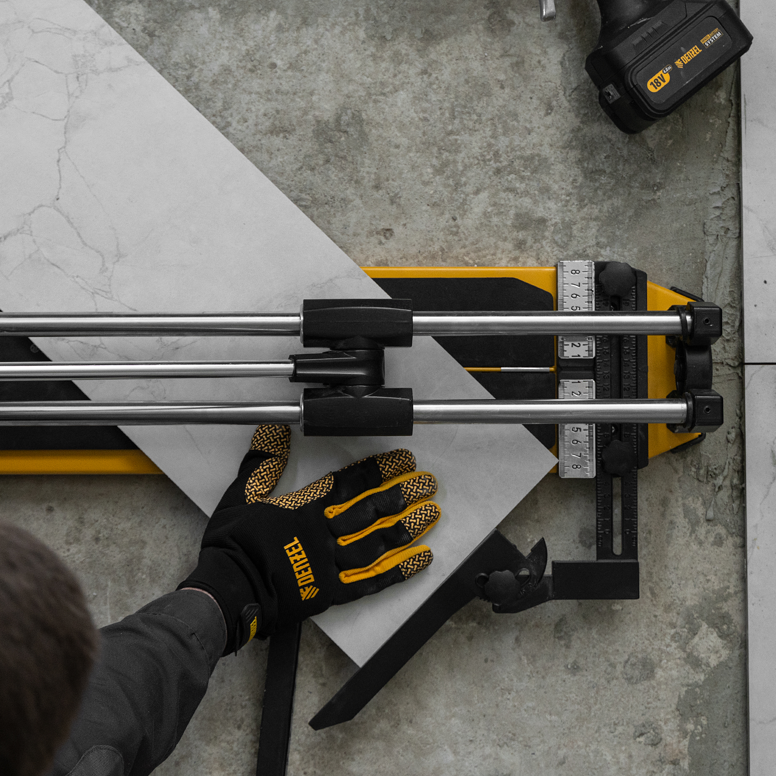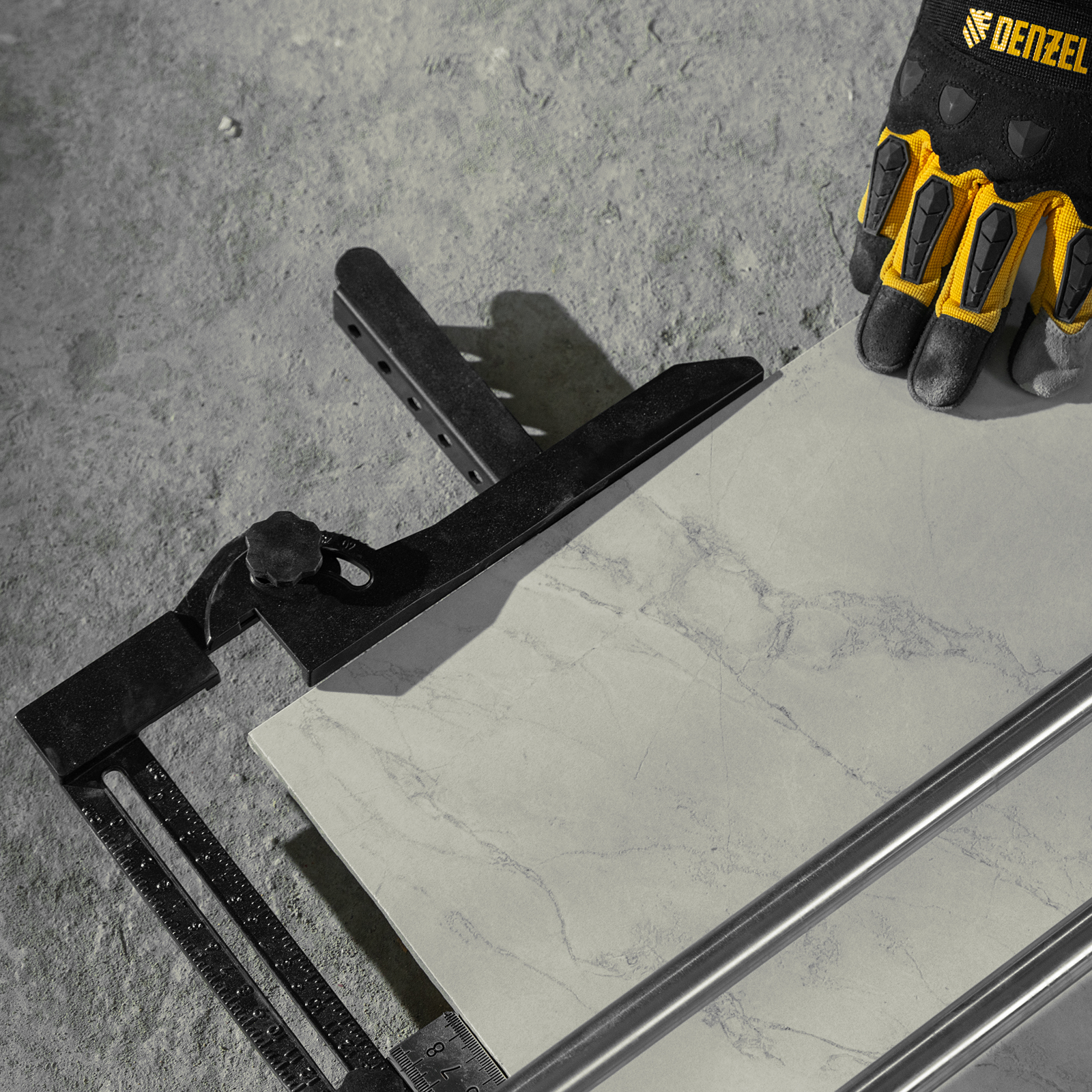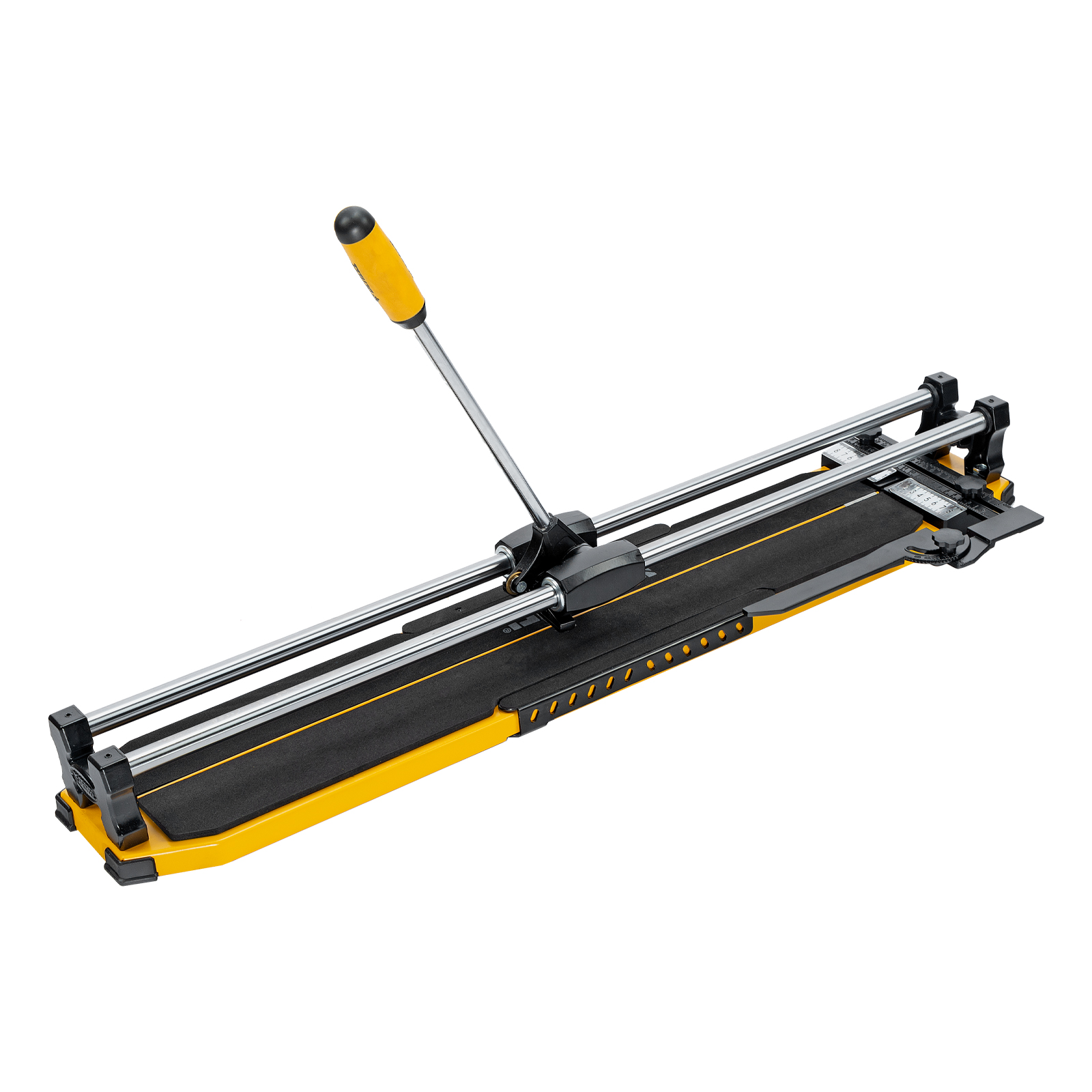 - Удобная работа — благодаря противоскользящим накладкам плиткорез не смещается даже на гладких поверхностях.