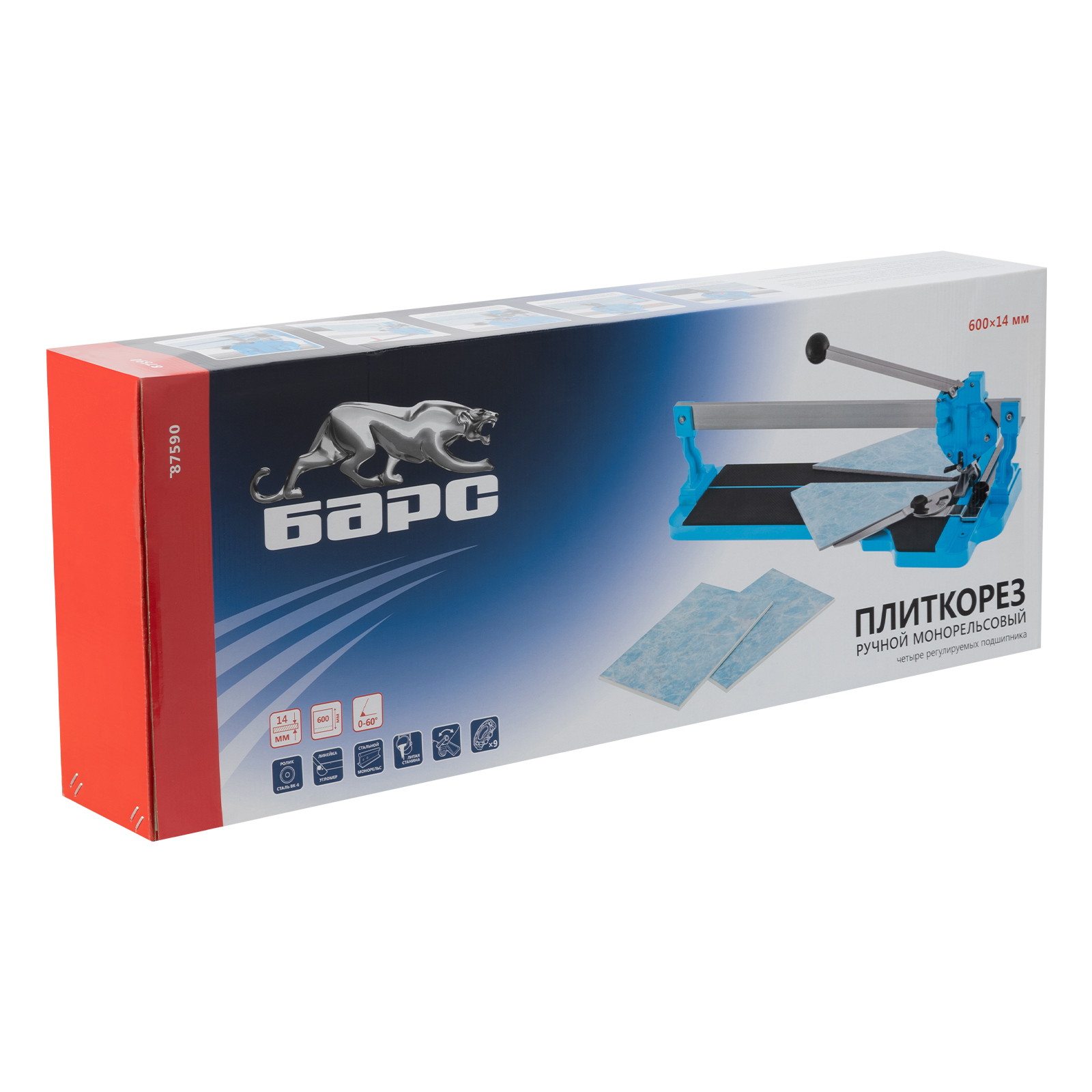 Ручной монорельсовый плиткорез Барс 87590 с ходовой кареткой, с 4 регулируемыми подшипниками из 9 и литой станиной, применяется для резки плитки размером до 600 х 14 мм. Плиткорез оснащен усиленным стальным монорельсом и опорами. Мощный разделитель позволяет эффективно резать любую плитку: керамическую и керамогранитную.
