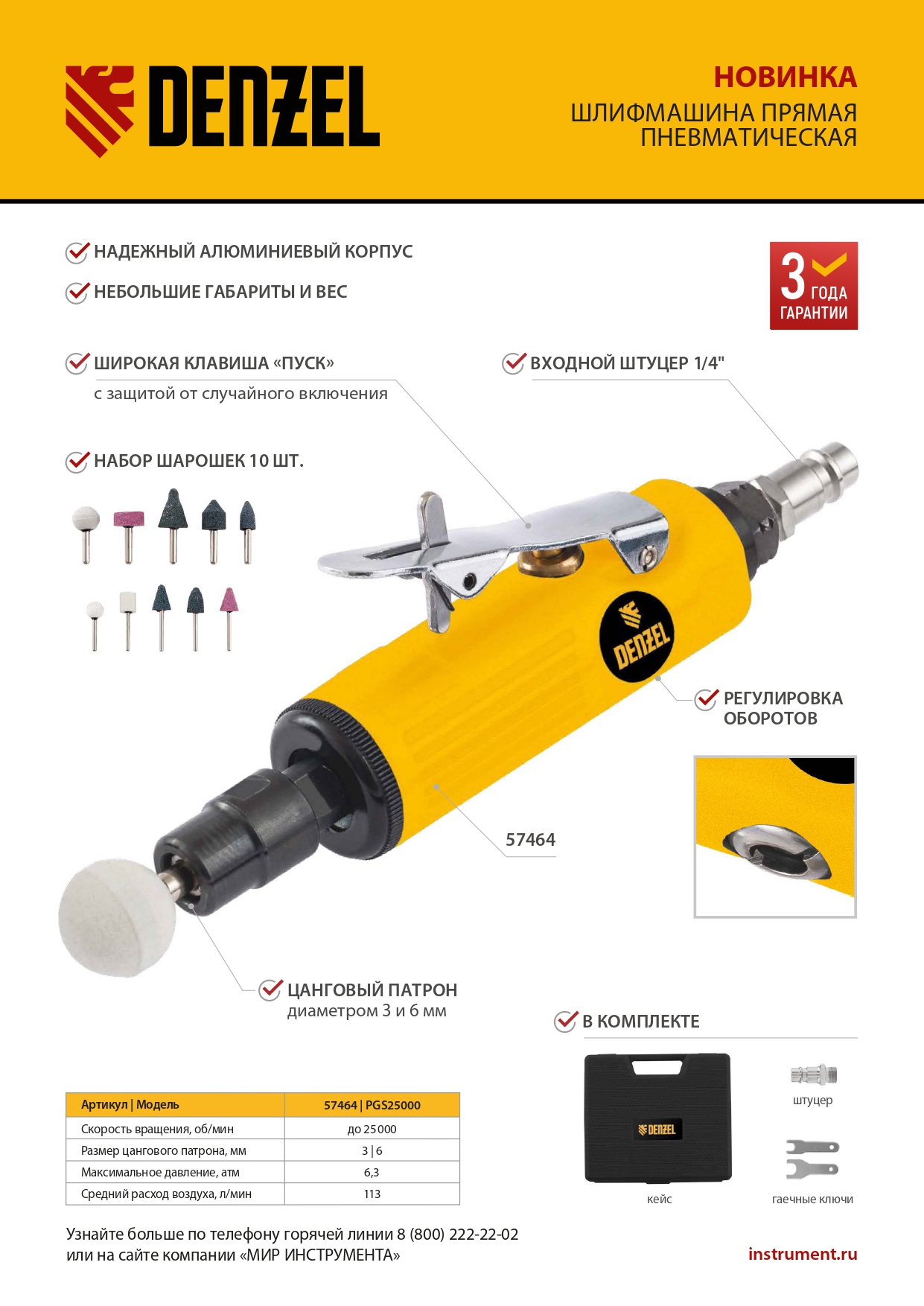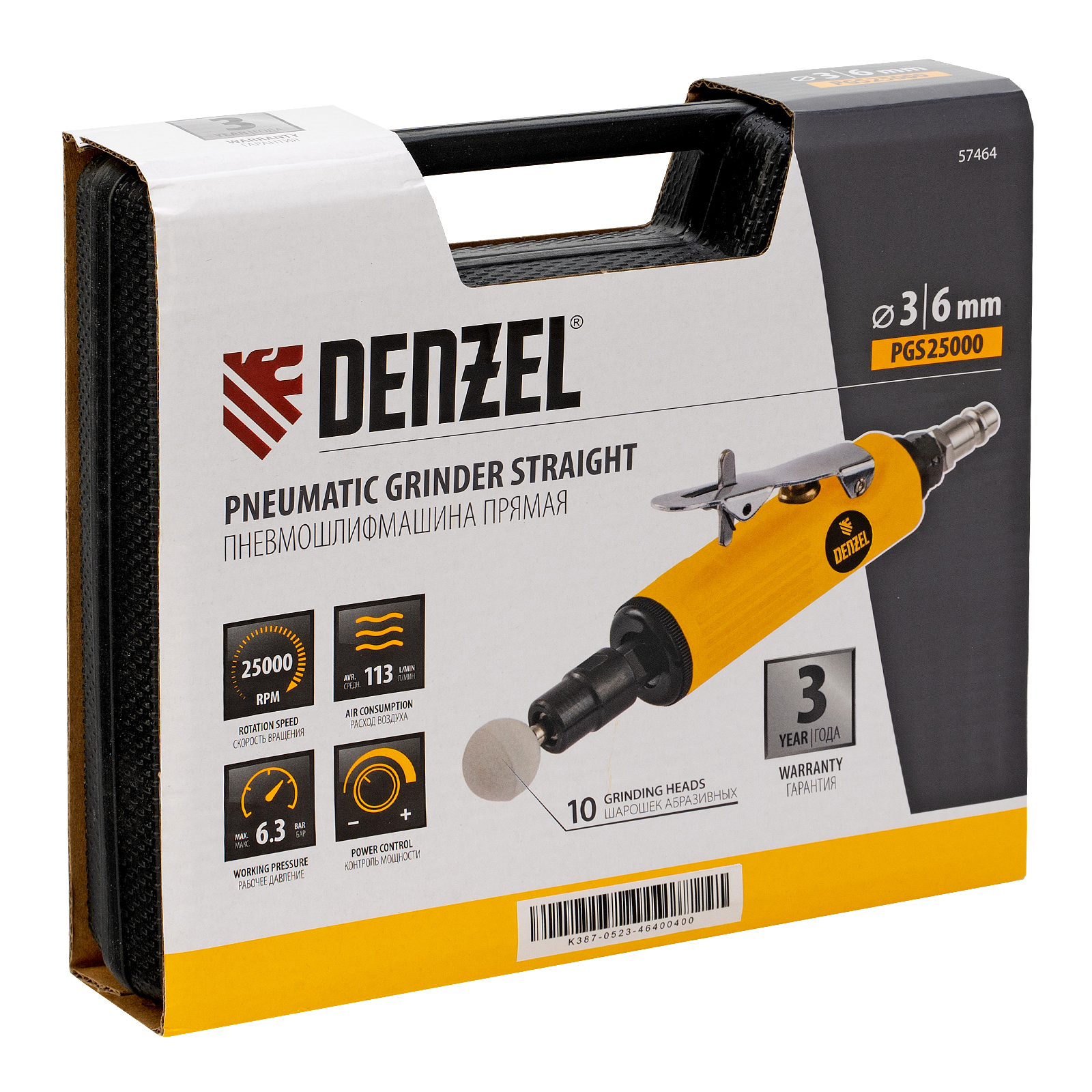 Пневмошлифмашина прямая PGS25000, 25000 об/мин, 10 шлиф. камней, цанга - 3, 6 мм, 113 л/мин Denzel в Казани