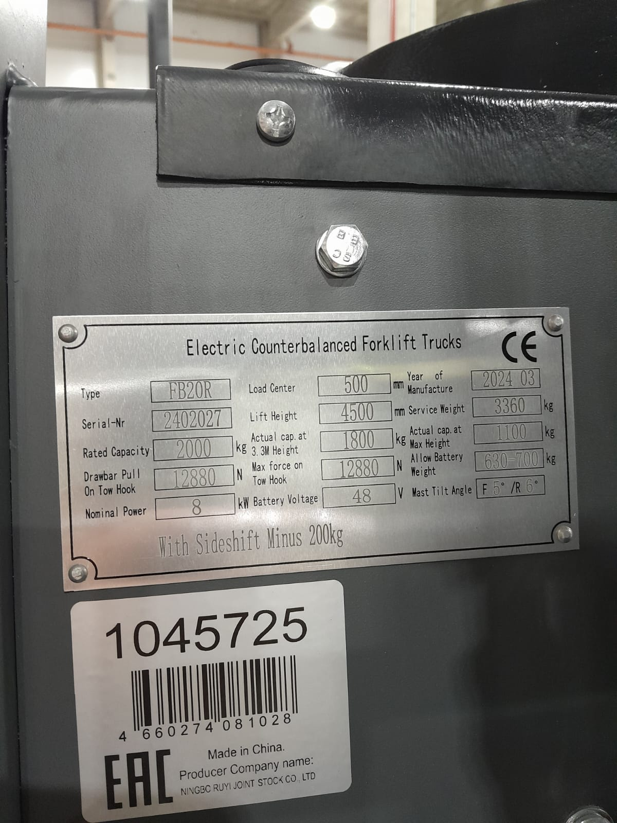 Погрузчик электрический четырехопорный TOR 2,0 т 4,5 м FB20R сайдшифт, своб. ход мачты