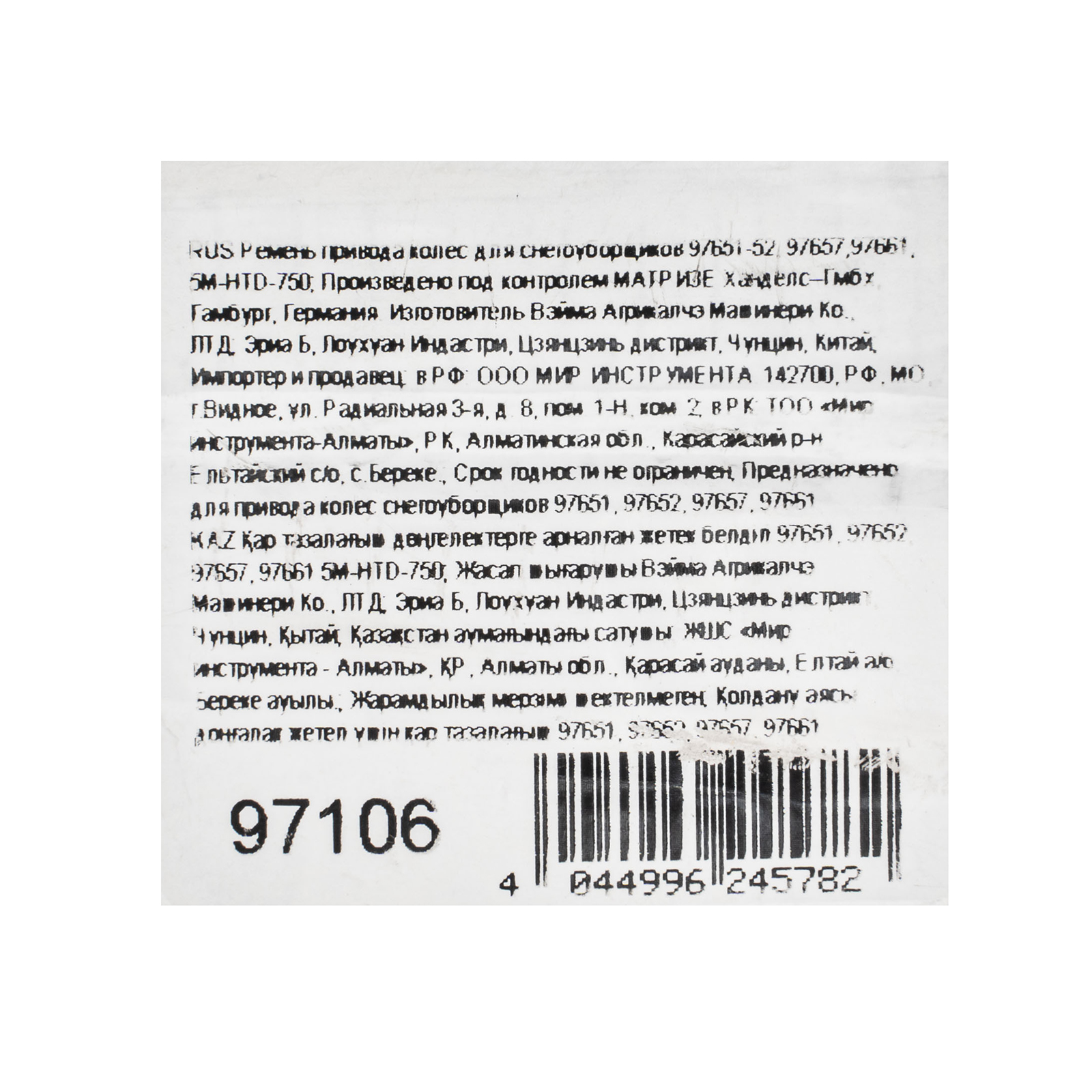 Зубчатый ремень привода шнека 5M-HTD-750 97106 используется в качестве запасного аксессуара для снегоуборочных машин SB 560 97651, SB 560 LP 97652, BM 610DT PRO 97657 и SWB-600 97661. Предназначен для передачи крутящего момента, позволяет восстановить работоспособность техники после выхода из строя старого ремня.
