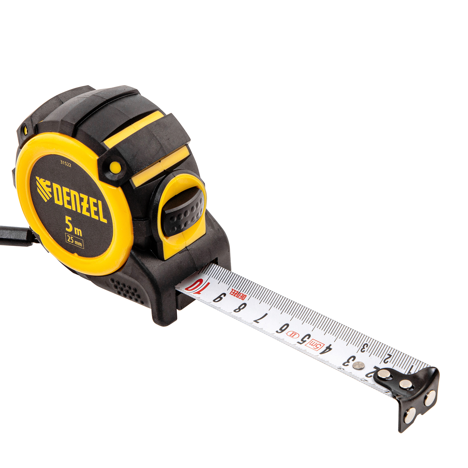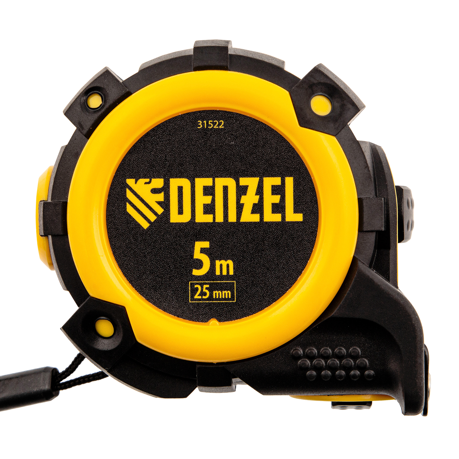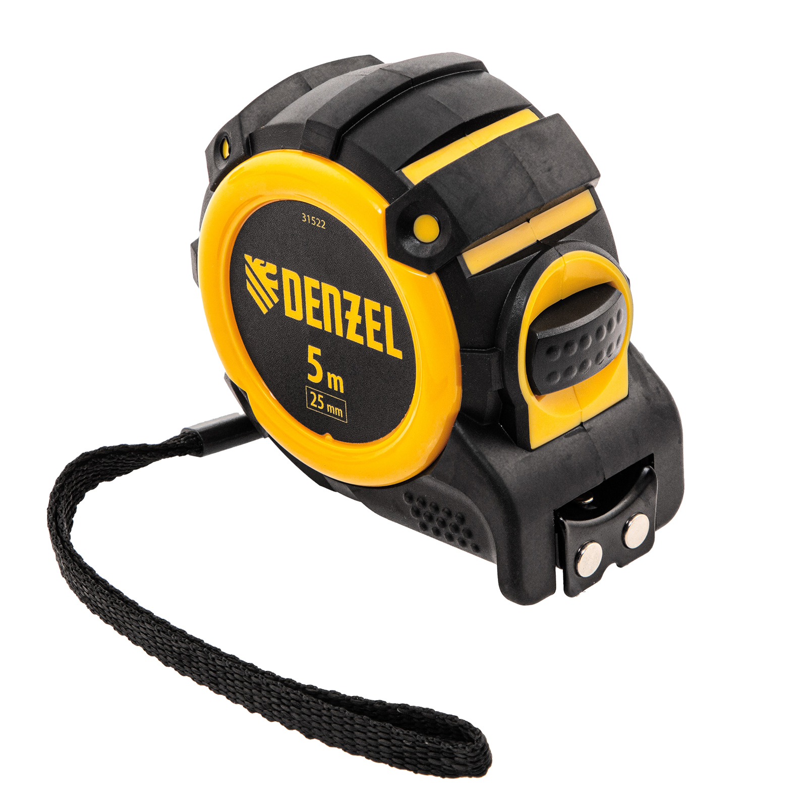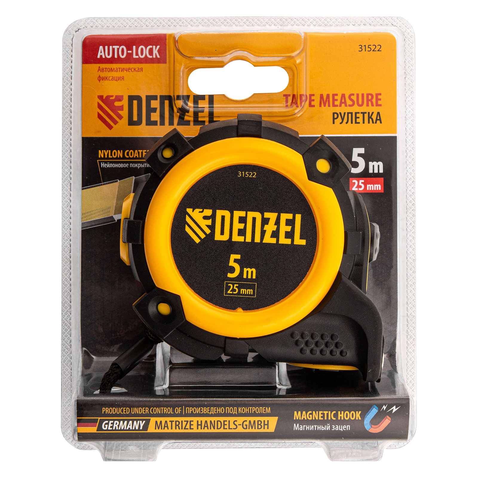 Рулетка 5м х 25мм, автоматич. фиксац., нейлон. покрытие, магнит. зацеп, двухстор. разметка Denzel