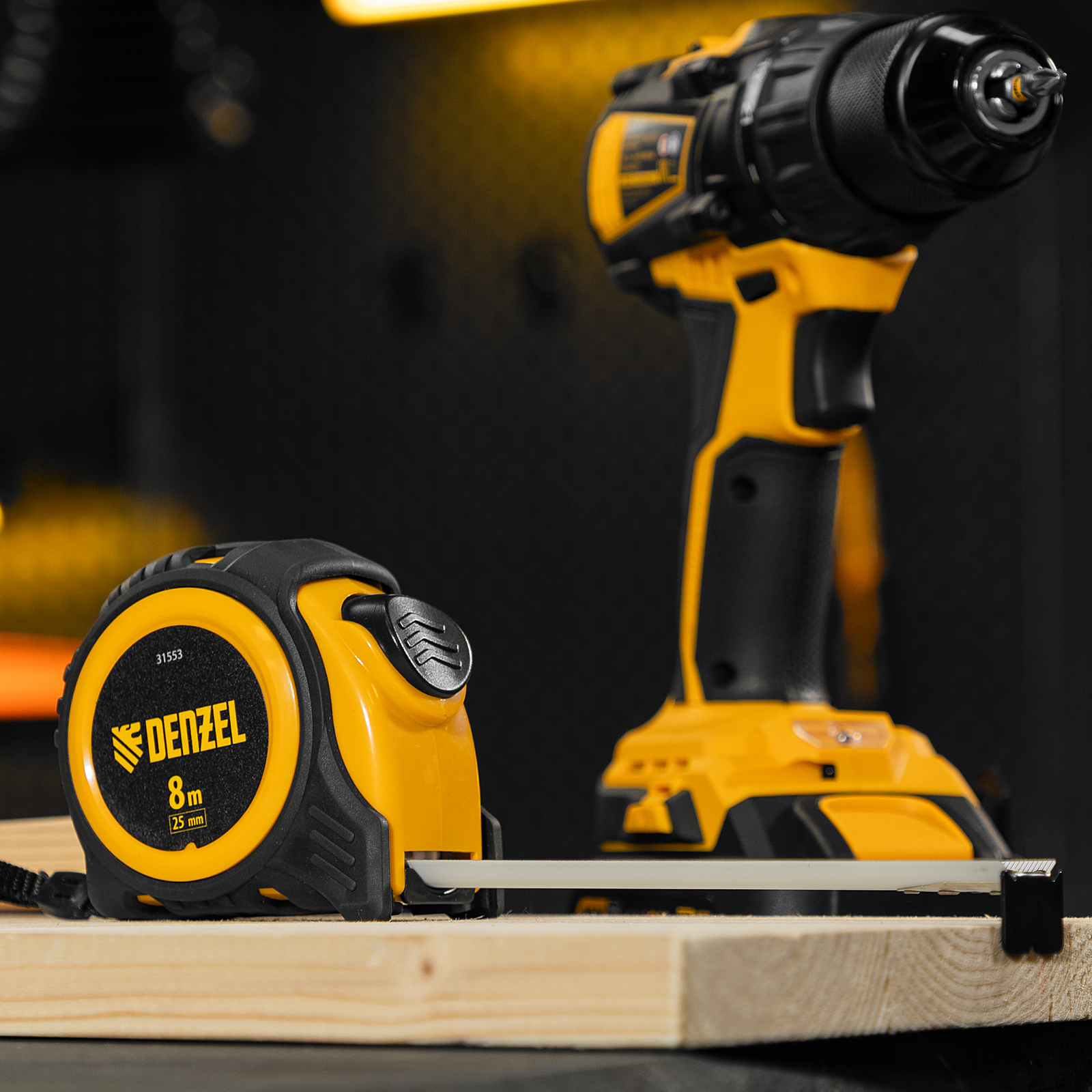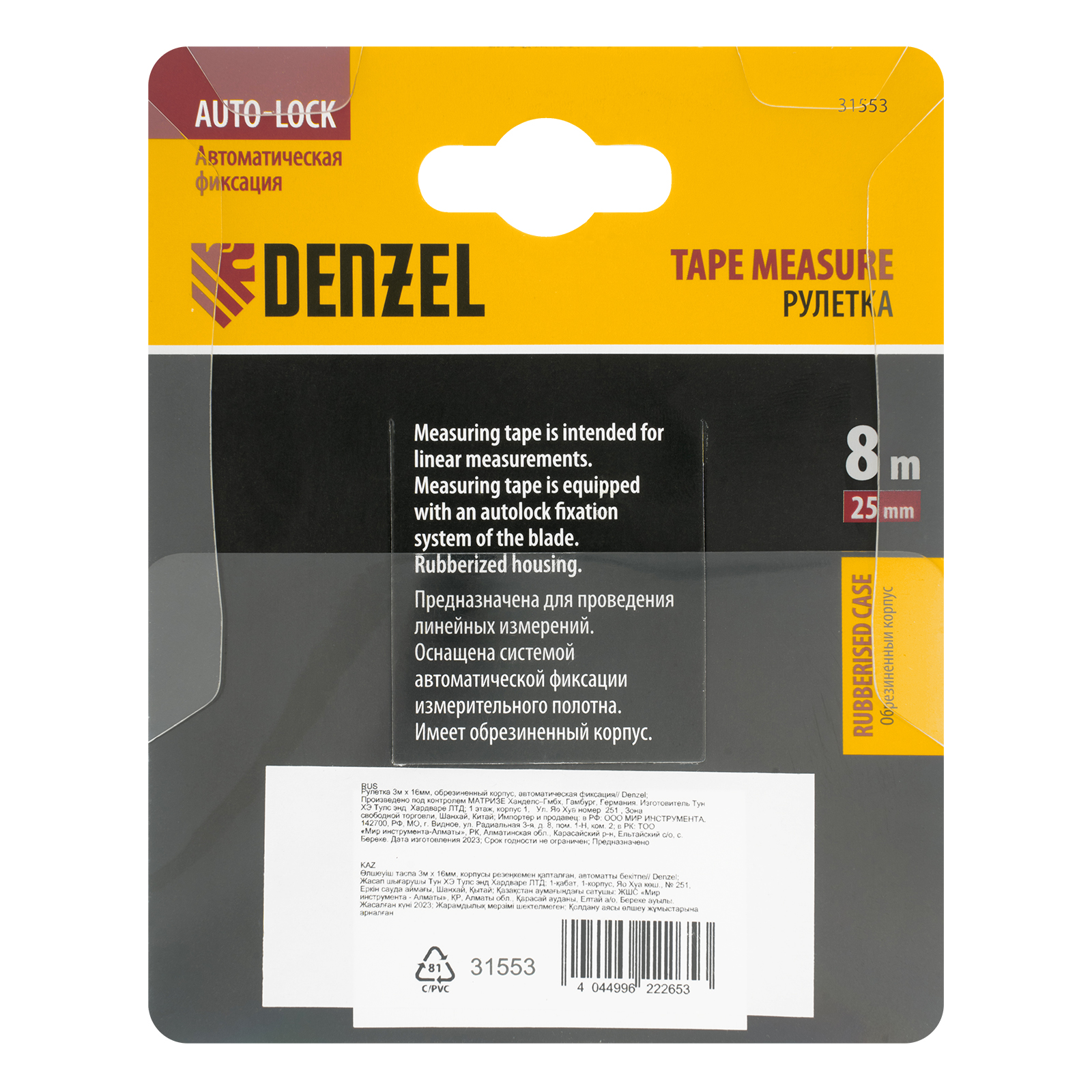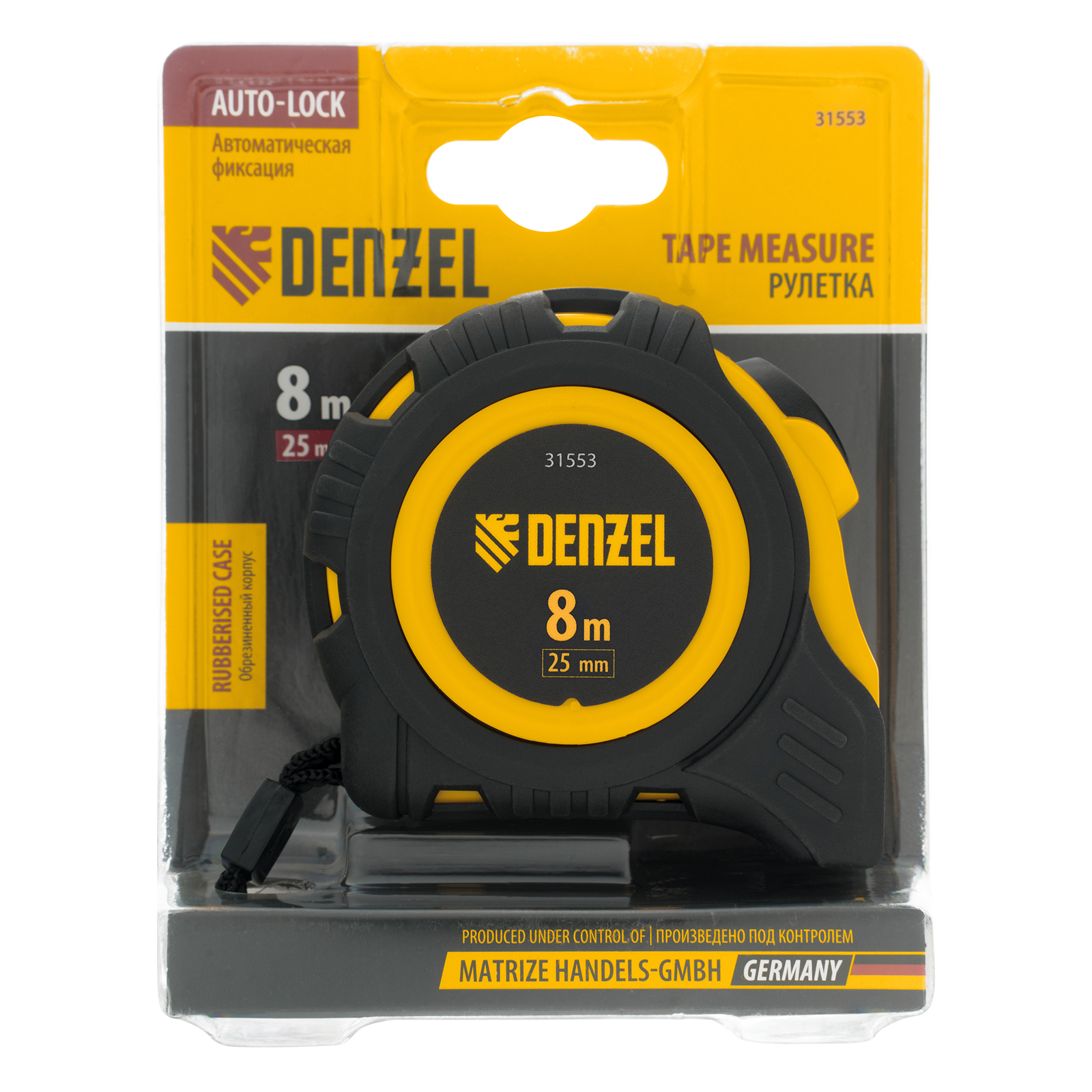 Рулетка Denzel 31553 в обрезиненном корпусе, с автоматической фиксацией, с полотном шириной 25 мм и длиной 8 м, используется для измерения расстояний и размеров предметов. Стальная лента с эмалевым покрытием и защитной пластиной в месте крепления зацепа рассчитана на долгий срок службы. Рулетка будет полезна во время строительства и ремонта, а также пригодится в быту.