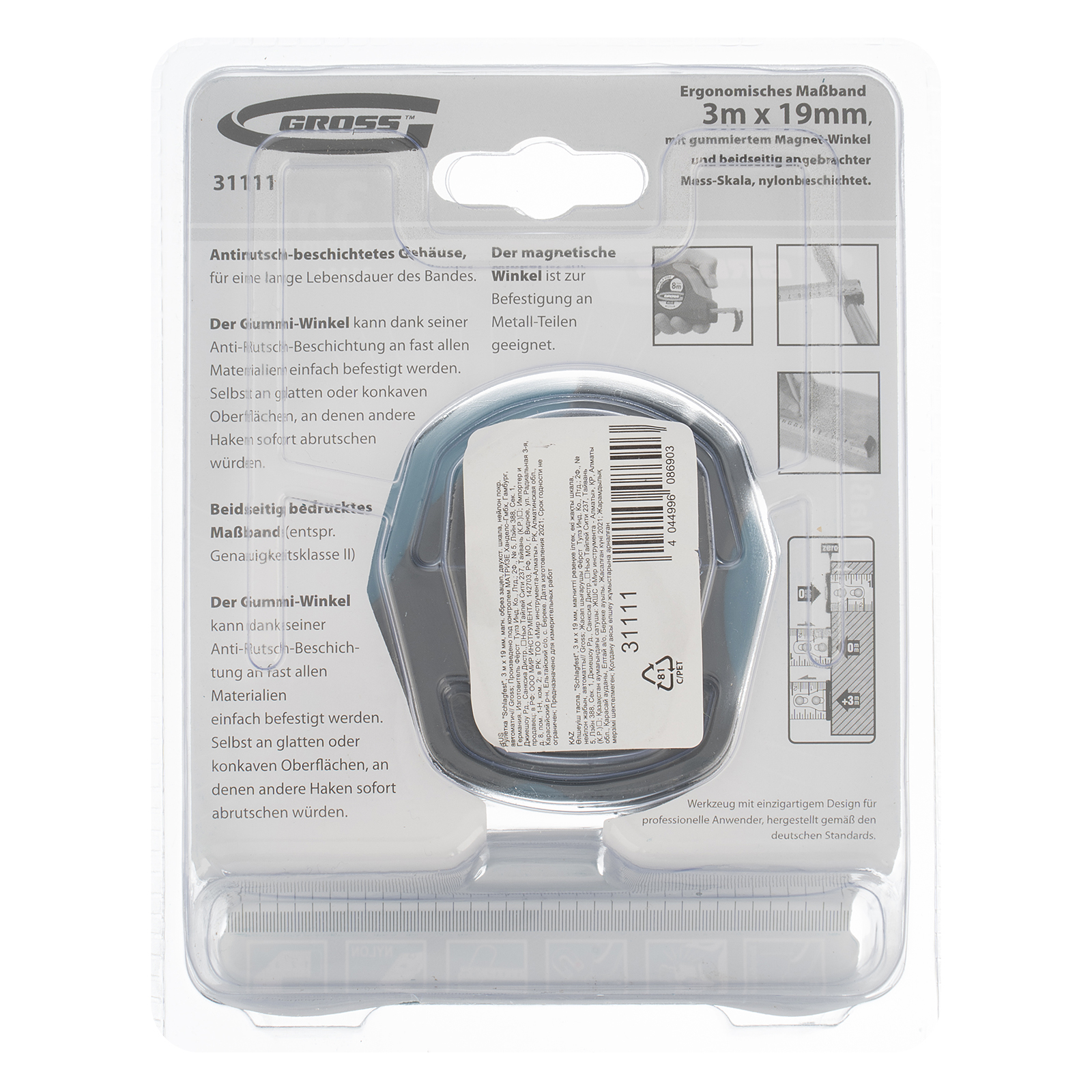 Рулетка Gross «Schlagfest» 31111 с магнитным обрезиненным зацепом, двухсторонней шкалой и функцией автоматической фиксации полотна длиной 3 м и шириной 19 мм, с нейлоновым покрытием, позволяет определять размеры предметов, вычислять площадь помещения и проводить другие измерительные работы. Магнитный обрезиненный зацеп надежно фиксируется на скользких и металлических поверхностях со сложной формой. Карманная рулетка пригодится на строительной площадке и в быту.