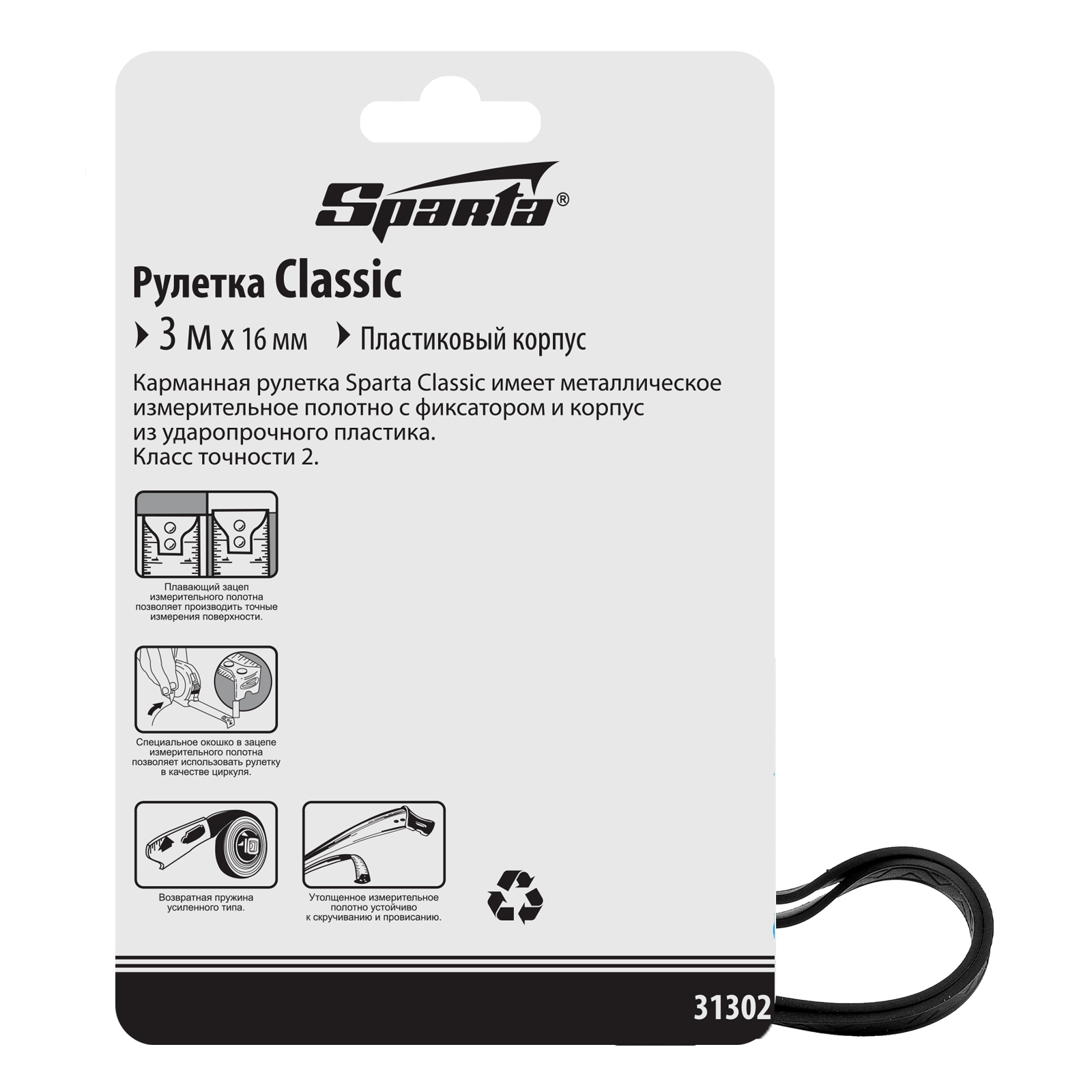 Рулетка Sparta «Classic» 31302 с полотном 3 м х 16 мм, в пластиковом корпусе, станет незаменимым помощником в хозяйстве при измерении длины и ширины деталей, заготовок, материалов, мебели и т.д. Она рассчитана на бытовое использование. За счет специального окошка на зацепе рулетка подходит для применения в качестве циркуля.