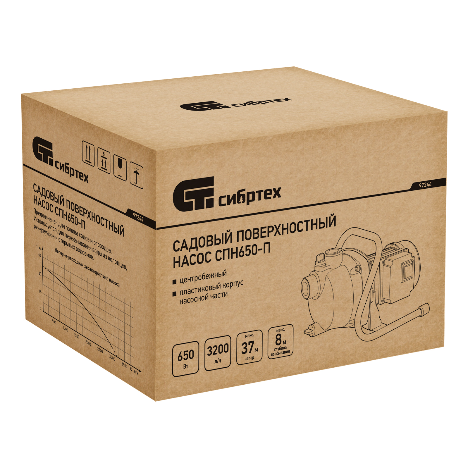 Садовый поверхностный насос СПН650-П, 650 Вт, напор 37 м, 3200 л/ч, пластик Сибртех