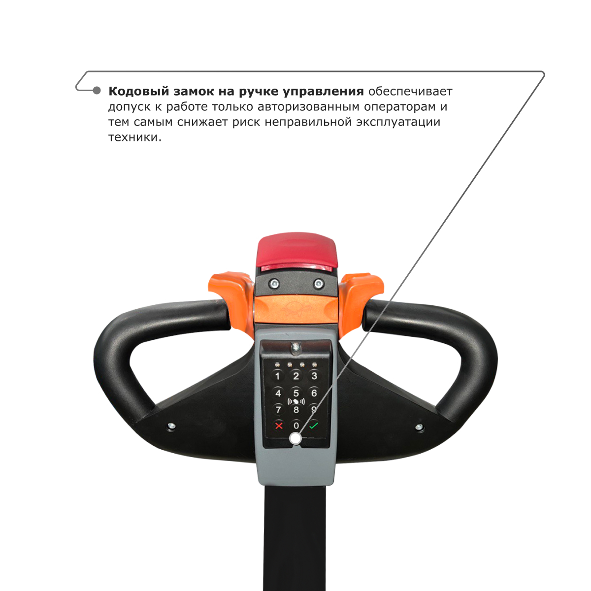 На штабелере установлены кнопка аварийного отключения, позволяющая быстро остановить штабелер в случае возникновения опасной ситуации, и защитный экран на мачте из оргстекла, оберегающий оператора от возможных травм. Ручка управления имеет интегрированный замок зажигания и полный набор необходимых клавиш управления, в том числе кнопку «черепашьего хода».