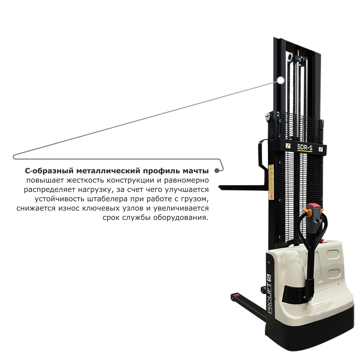 Самоходный электрический штабелер PROLIFT M2 грузоподъемность 1500 кг, высота подъема 3500 мм SDR 1535s предназначен для поднятия груза весом до 1500 кг на высоту до 3500 мм. Подъем груза и перемещение штабелера осуществляется благодаря двум электродвигателям без необходимости прилагать физические усилия оператору, что значительно облегчает труд сотрудника и повышает производительность.