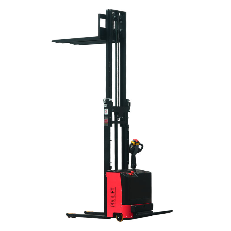 Самоходный штабелер PROLIFT SDK1545 с литий-ионной АКБ предназначен для поднятия груза весом до 1500 кг на высоту до 4500 мм. Подъем груза и перемещение штабелера осуществляется благодаря двум электродвигателям без необходимости прилагать физические усилия оператора. Управление штабелером производится стоя на платформе или, если сложить платформу, следуя за ней. Благодаря наличию откидной платформы и складных поручней для оператора на ней очень удобно перемещать грузы на дальние расстояния. Использование таких штабелеров значительно повышает производительность труда. Мачта выполнена из С-образного профиля с дополнительными ребрами жесткости. На самоходном штабелере PROLIFT SDK1545 установлен аккумулятор Li-ion емкостью 150 Ач. Встроенный индикатор заряда показывает напряжение АКБ, позволяя поддерживать оборудование в рабочем состоянии. С целью повышения безопасности и комфорта работы, на штабелере установлено множество дополнительных элементов. В частности: кнопка аварийного отключения, позволяющая быстро отключить штабелер в случае возникновения опасной ситуации, защитный экран на мачте из оргстекла, защищающий оператора от возможных травм, а ручка управления имеет интегрированный замок зажигания и полный набор необходимых клавиш управления, в том числе кнопку «черепашьего хода».  Также особенностью данного штабелера является наличие функции свободного подъема вил.