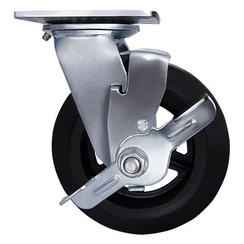 Колесо большегрузное обрезиненное поворотное с тормозом SCDB42 предназначено для строительного, коммунального и складского оборудования. Шинка выполнена из термопластичной черной резины. Материал отличается высокой износостойкостью и сопротивляемостью к неблагоприятным воздействиям внешней среды. Колесо не требовательно к качеству напольного и дорожного покрытия. Обод выполнен из чугуна и оснащен смазочным ниппелем. В оси установлен роликовый подшипник. В поворотном механизме установлен двухрядный шариковый подшипник с пресс-масленкой. Кронштейн — сварной, изготовлен из оцинкованной листовой стали. Диапазон температур — от -35ºC до +50ºC.