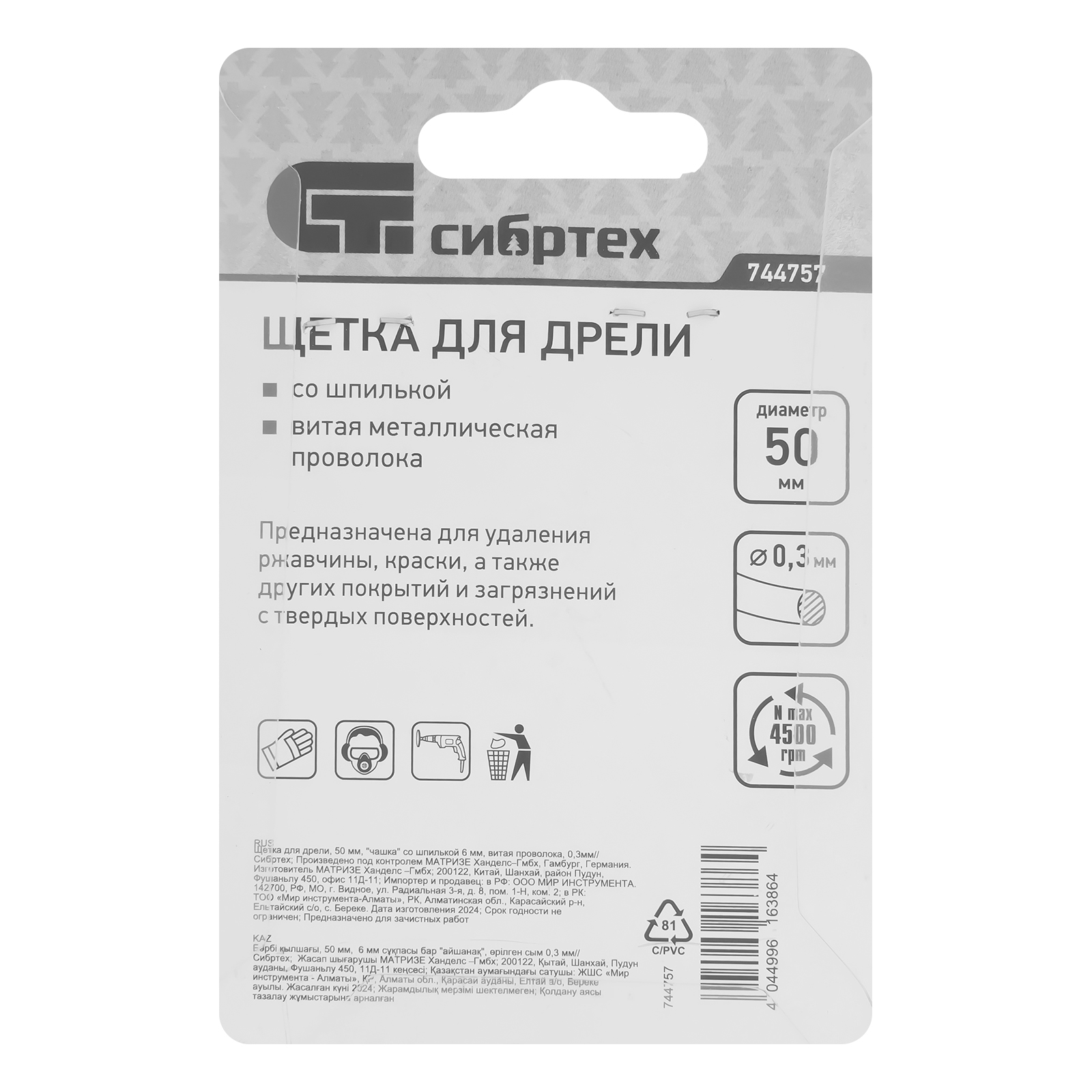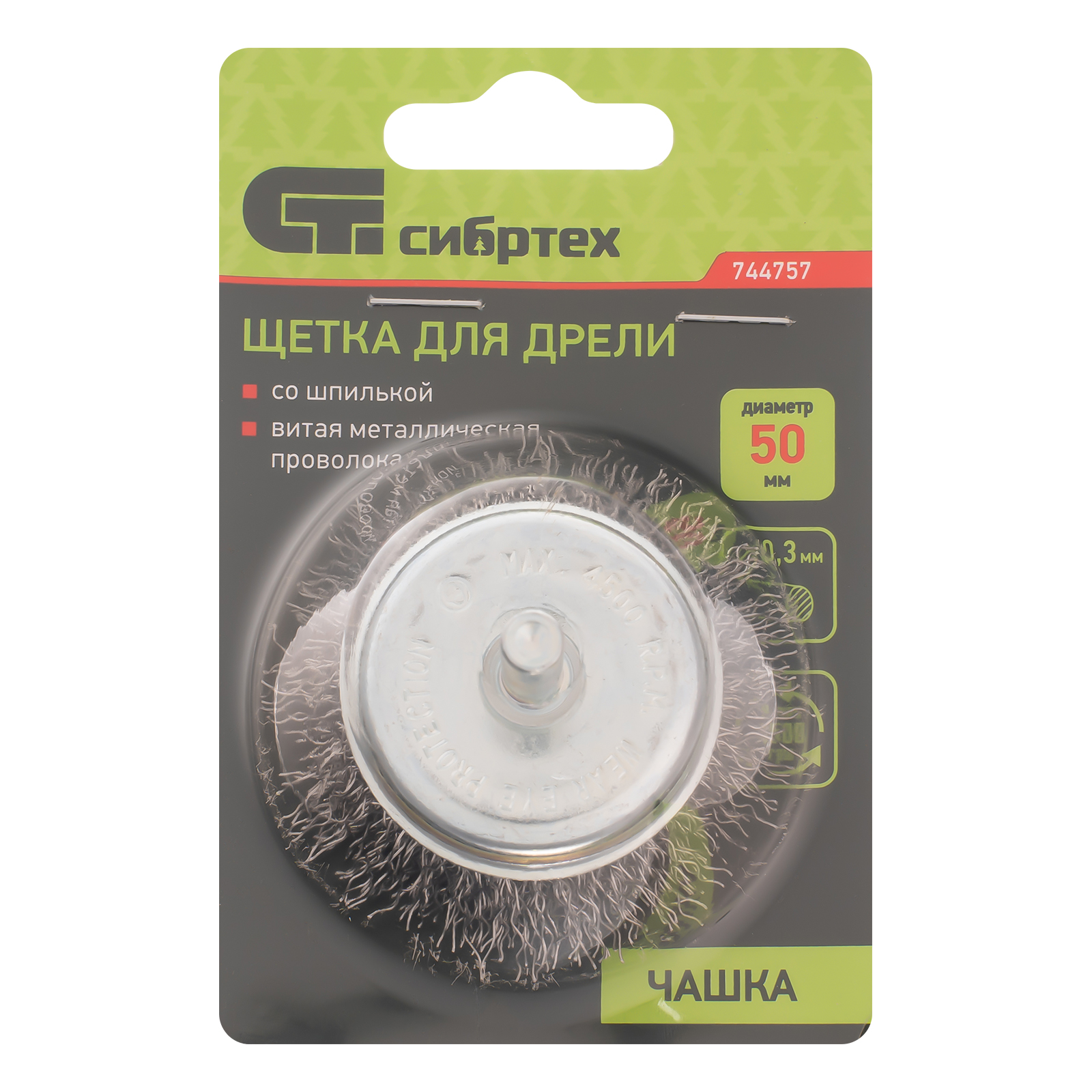 Щетка для дрели «чашка» Сибртех 744757 диаметром 50 мм, со шпилькой и щетиной из витой проволоки 0,3 мм, предназначена для щадящей обработки значительных по площади металлических, деревянных и пластиковых поверхностей — удаления загрязнений, остатков краски и лака, придания шероховатости или подчеркивания структуры материала. Насадка с хвостовиком 6 мм устанавливается в патрон электродрели, поддерживающей работу со скоростью 4500 об/мин. Во время работы с инструментом обязательно использование защитной одежды и обуви, очков, респиратора и наушников. Щетку применяют в профессиональной сфере и в быту.