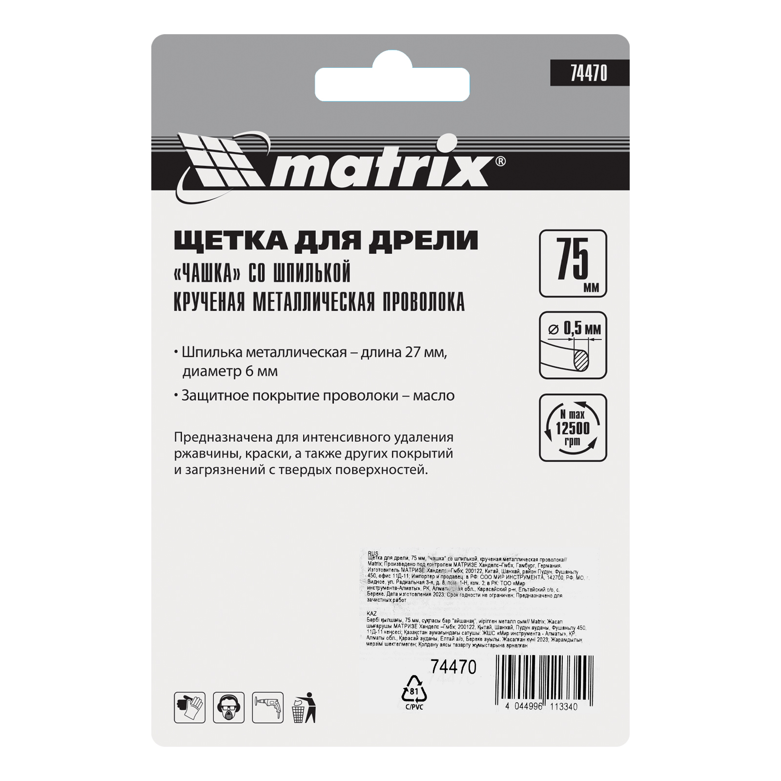 Щетка для дрели, 75 мм, "чашка" со шпилькой, крученая металлическая проволока Matrix в Казани