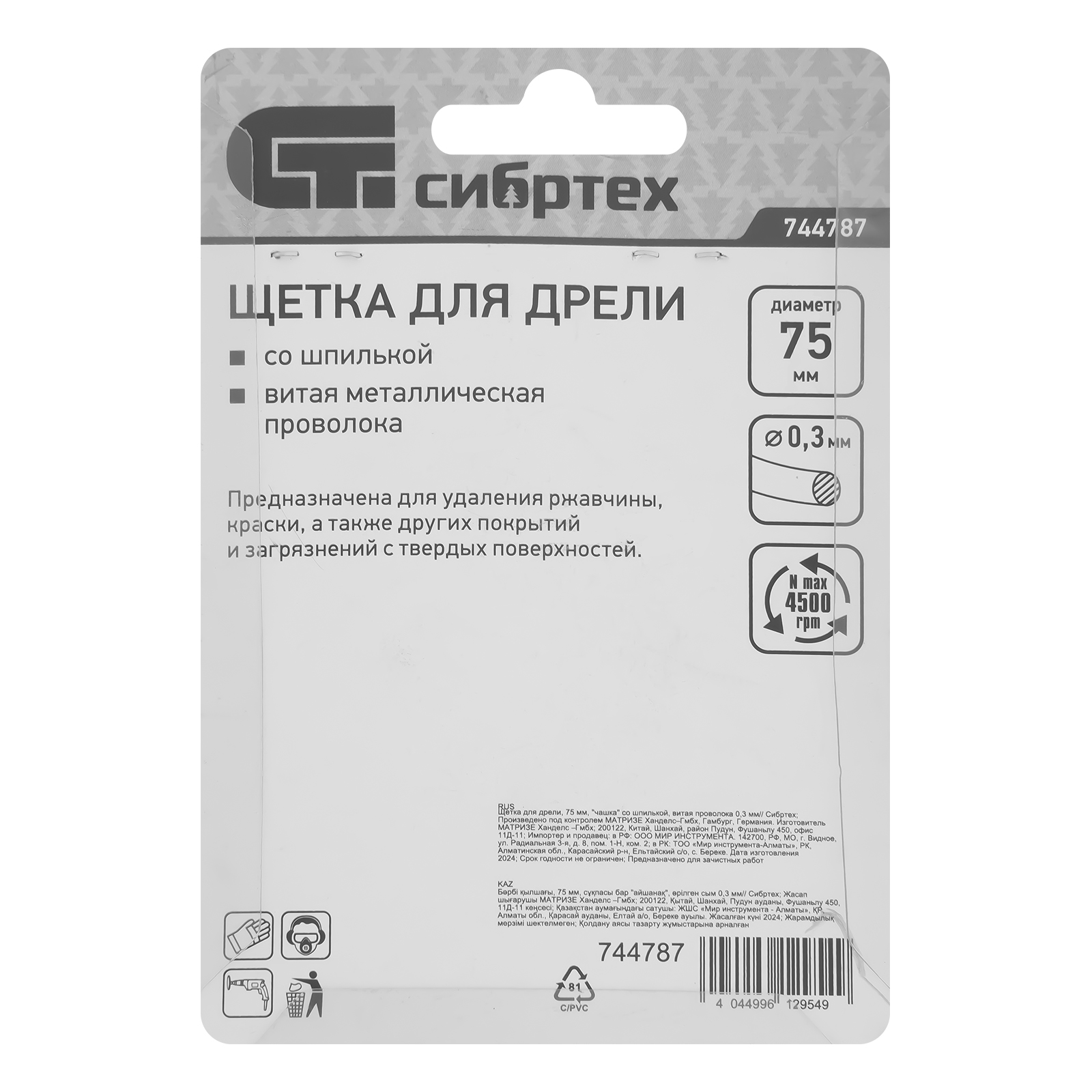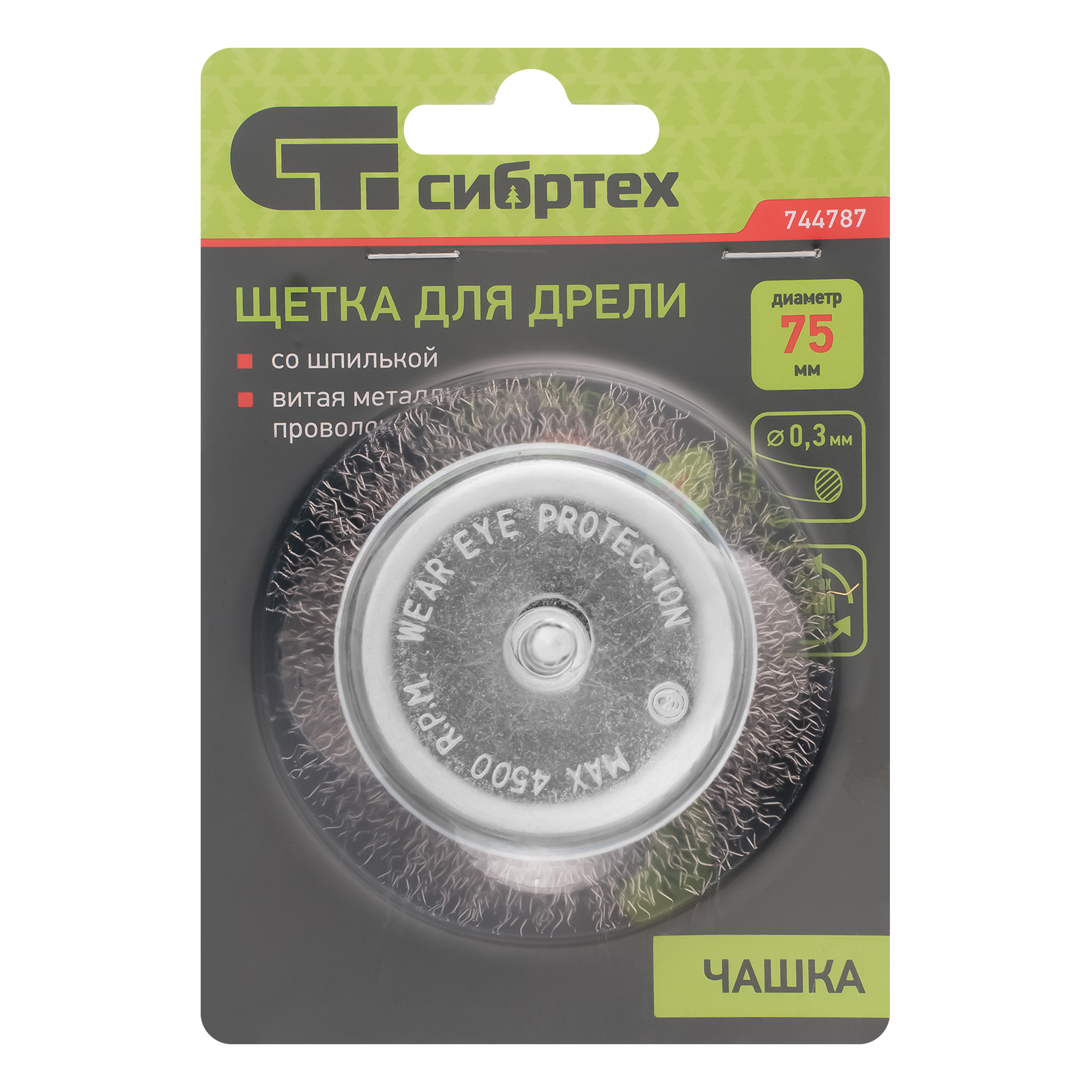 Щетка для дрели, 75 мм, "чашка" со шпилькой, витая проволока Сибртех в Казани