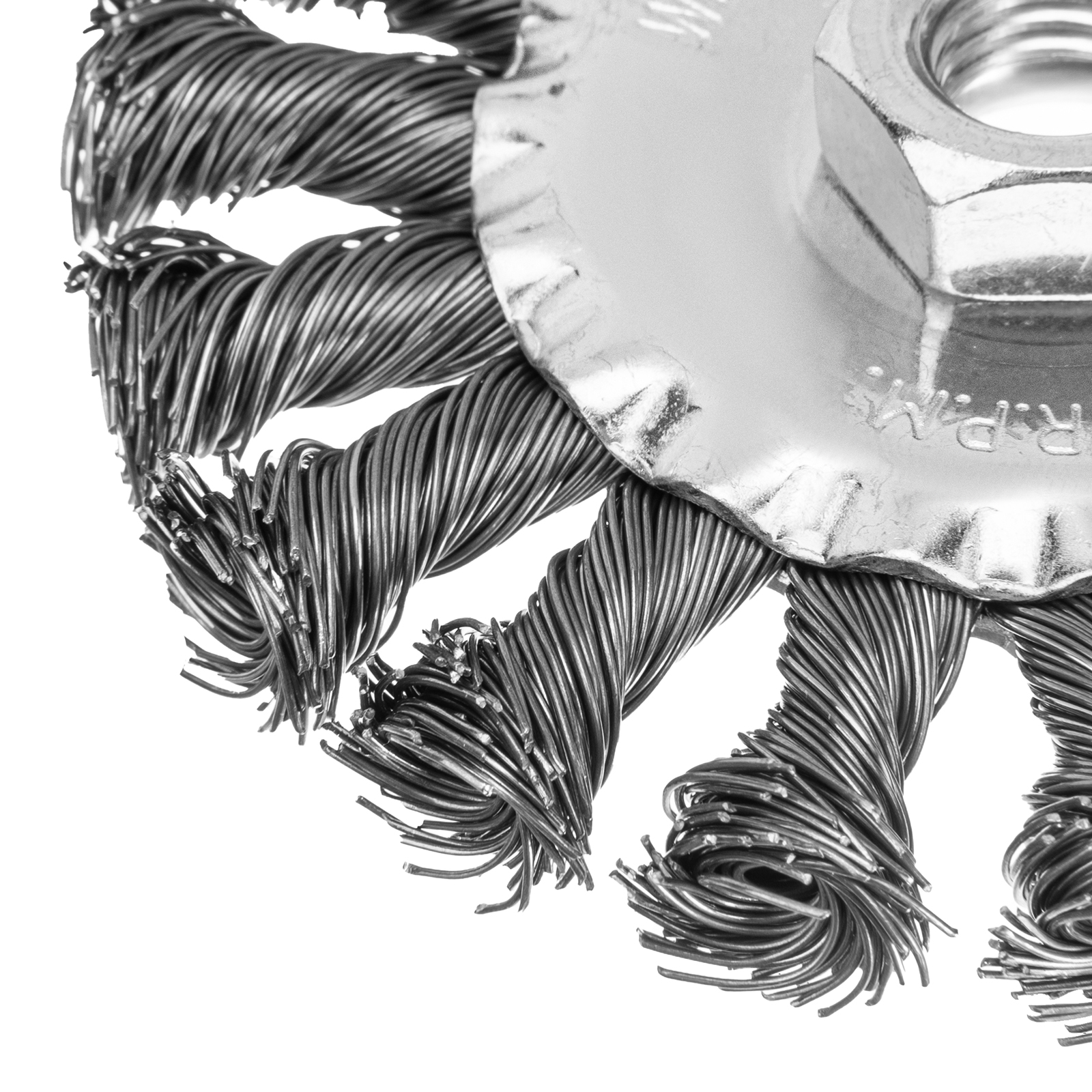 Плоская щетка Matrix 74639 диаметром 100 мм, с щетиной из крученой проволоки толщиной 0,5 мм и гайкой М14, — оснастка для УШМ, предназначенная для грубой (черновой) обработки поверхностей. Максимально допустимая скорость вращения шпинделя — 12500 об/мин. Щетка позволяет снять толстый слой ржавчины, лакокрасочных покрытий, загрязнений, а также зачистить сварные швы. Плоская форма удобна для обработки углов, изгибов и других труднодоступных мест.