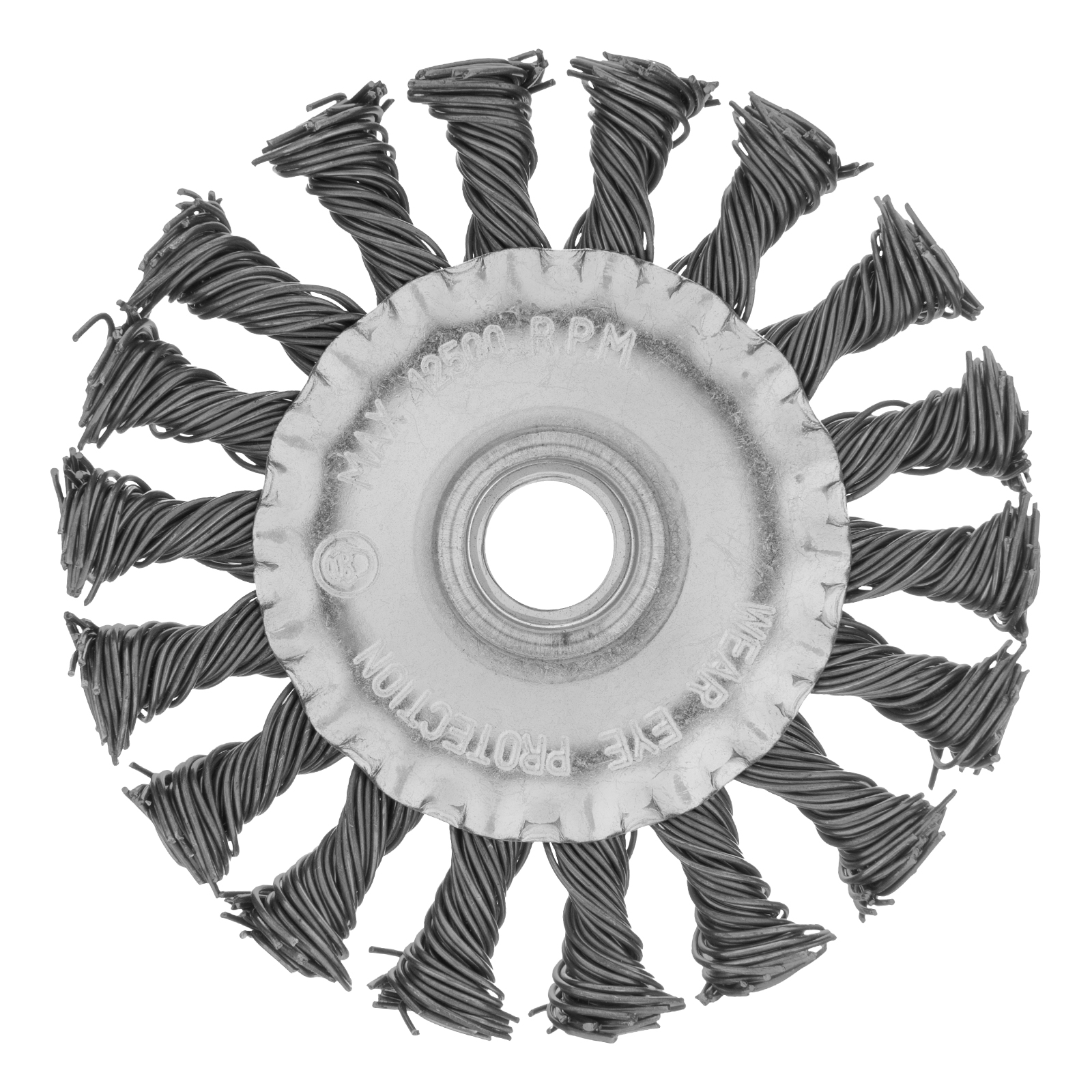 Плоская щетка Matrix 74643 диаметром 100 мм, с щетиной из крученой проволоки толщиной 0,8 мм и гайкой М14, — оснастка для УШМ, предназначенная для грубой (черновой) обработки поверхностей. Максимально допустимая скорость вращения шпинделя — 12500 об/мин. Щетка позволяет снять толстый слой ржавчины, лакокрасочных покрытий, загрязнений, а также зачистить сварные швы. Плоская форма удобна для обработки углов, изгибов и других труднодоступных мест.