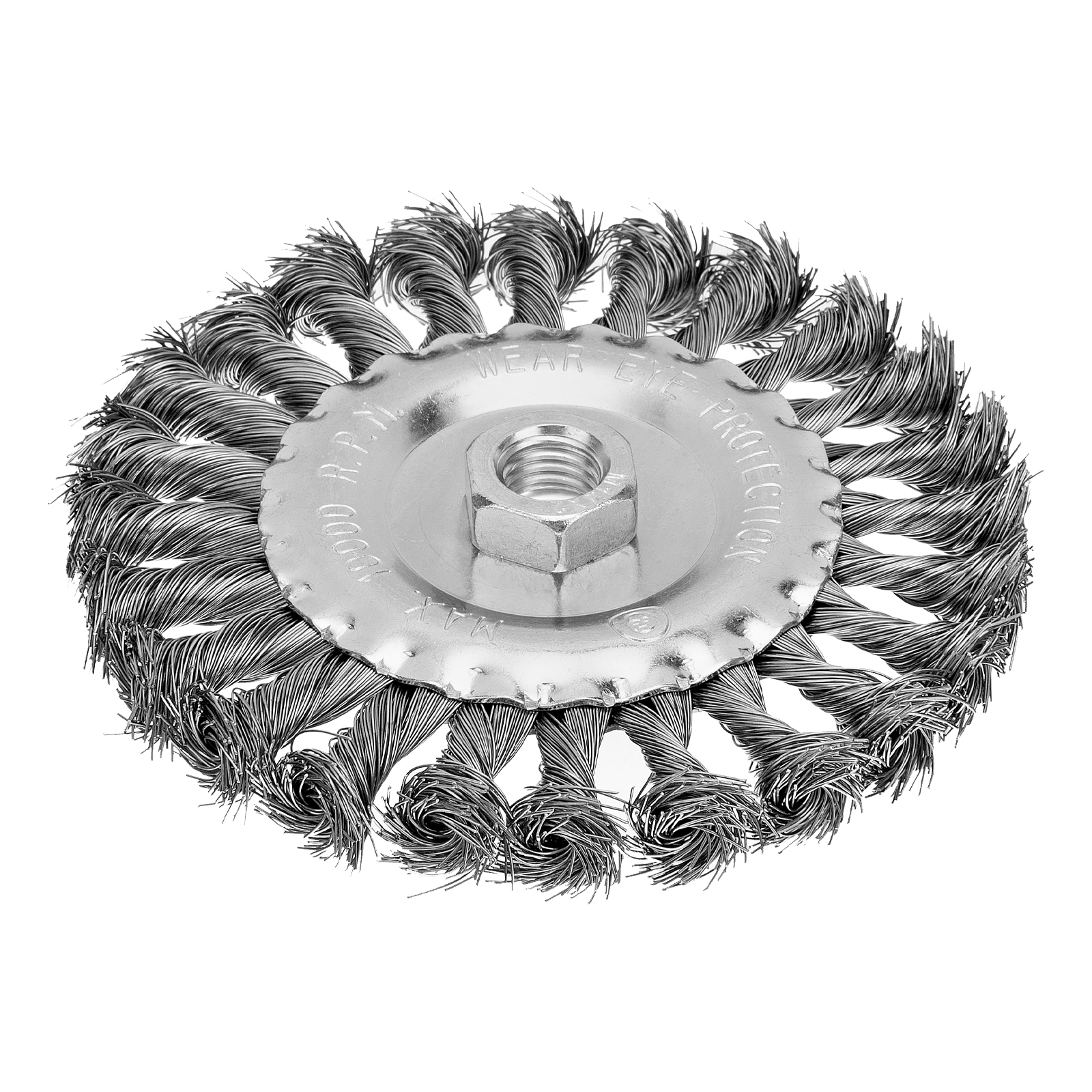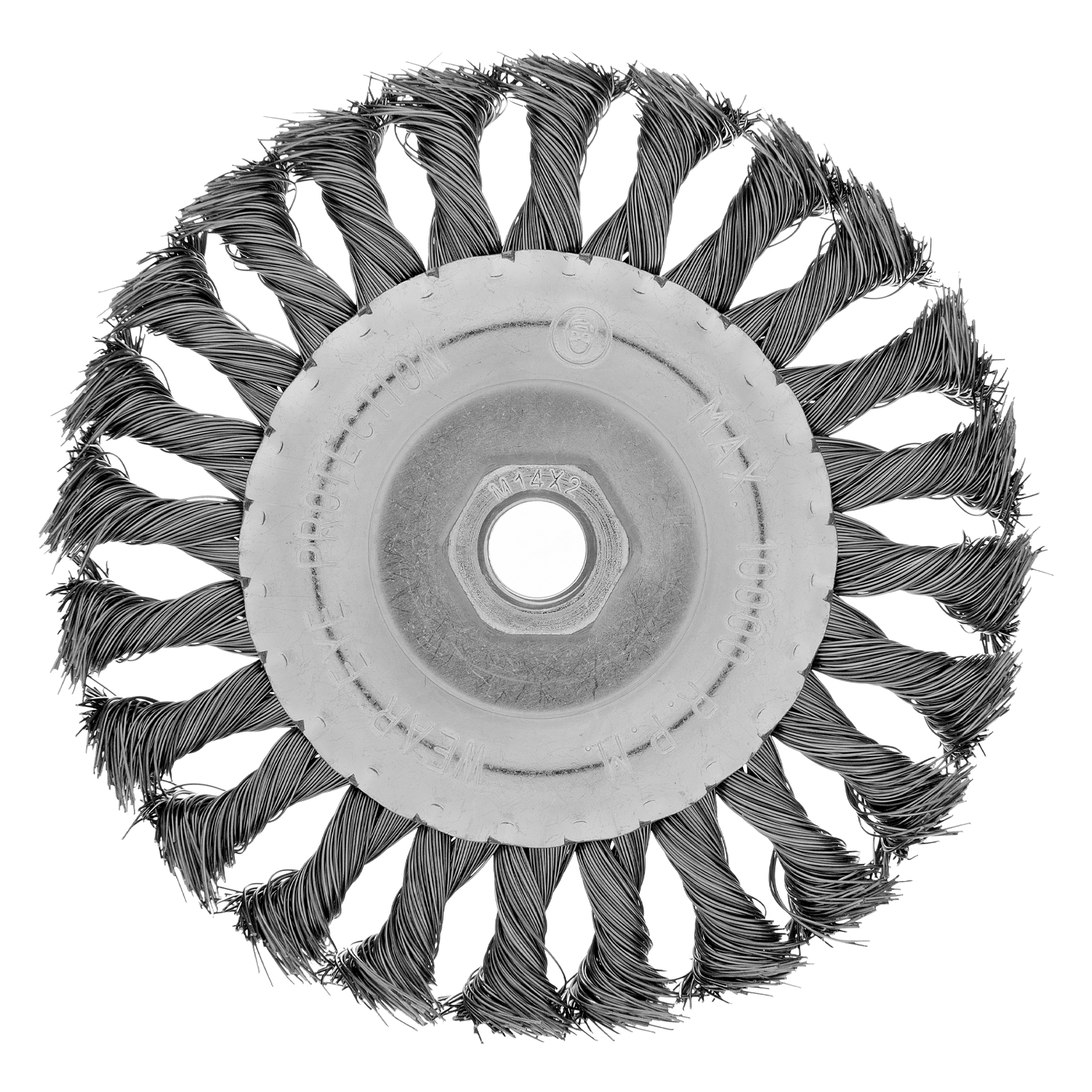 Плоская щетка Matrix 74633 диаметром 125 мм, с щетиной из крученой проволоки толщиной 0,35 мм и гайкой М14, — оснастка для УШМ, предназначенная для грубой (черновой) обработки поверхностей. Максимально допустимая скорость вращения шпинделя — 10000 об/мин. Щетка позволяет снять толстый слой ржавчины, лакокрасочных покрытий, загрязнений, а также зачистить сварные швы. Плоская форма удобна для обработки углов, изгибов и других труднодоступных мест.