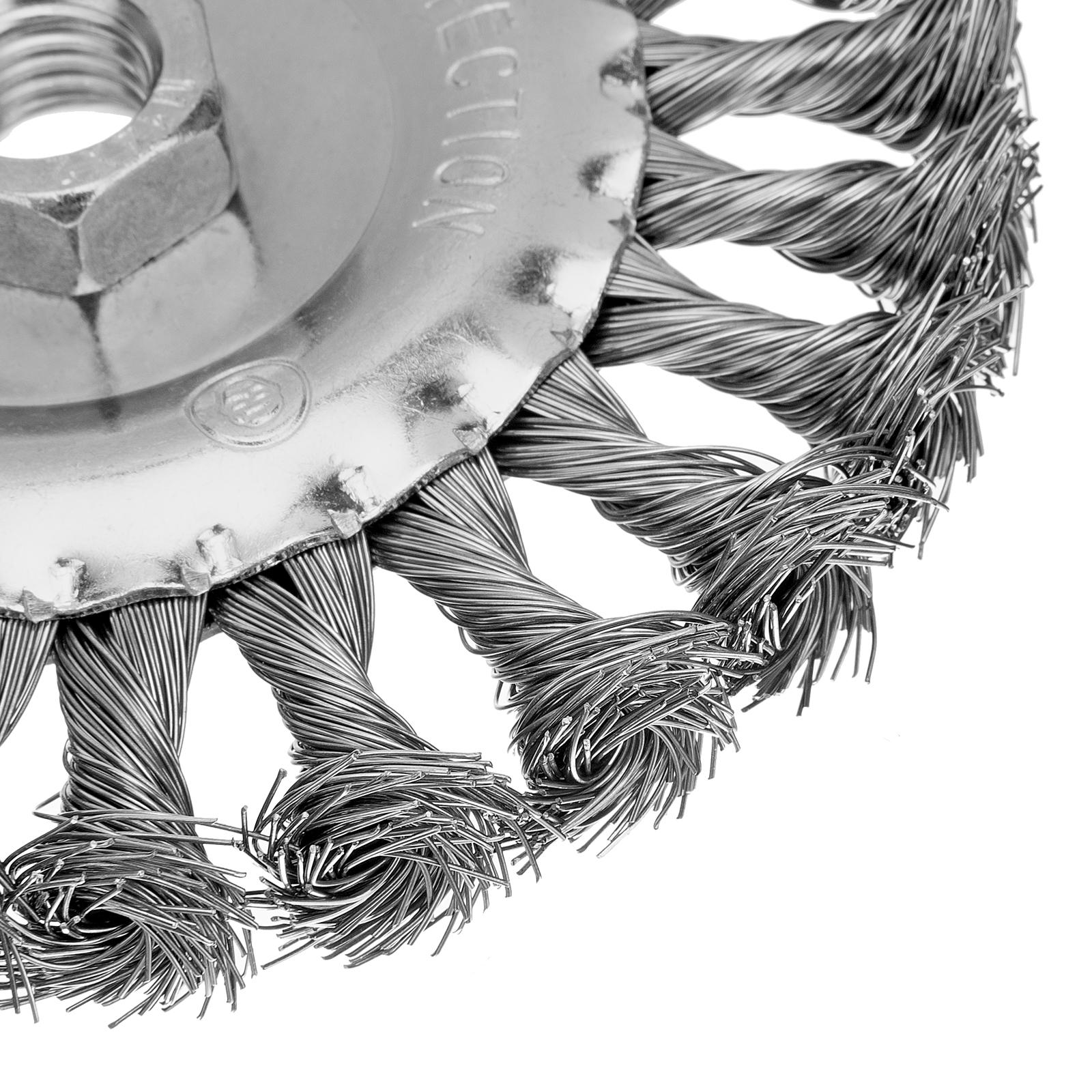 - Толщина щетины 0,35 мм — зачистка носит менее агрессивный характер, чем при использовании щеток с щетиной диаметром 0,5 мм.