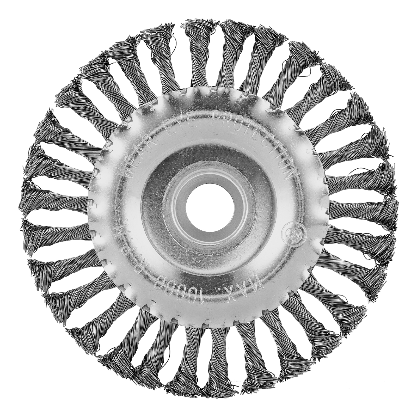 Плоская щетка Сибртех 746327 диаметром 125 мм и посадкой 22,2 мм, с щетиной из крученой проволоки толщиной 0,5 мм, устанавливается на вал УШМ, поддерживающей скорость вращения не более 10000 об/мин. Эффективно удаляет загрязнения, толстый слой ржавчины и лакокрасочных материалов с поверхностей, поэтому используется для проведения грубой (черновой) обработки. Плоской щеткой удобно очищать труднодоступные места, в том числе углы и изгибы.