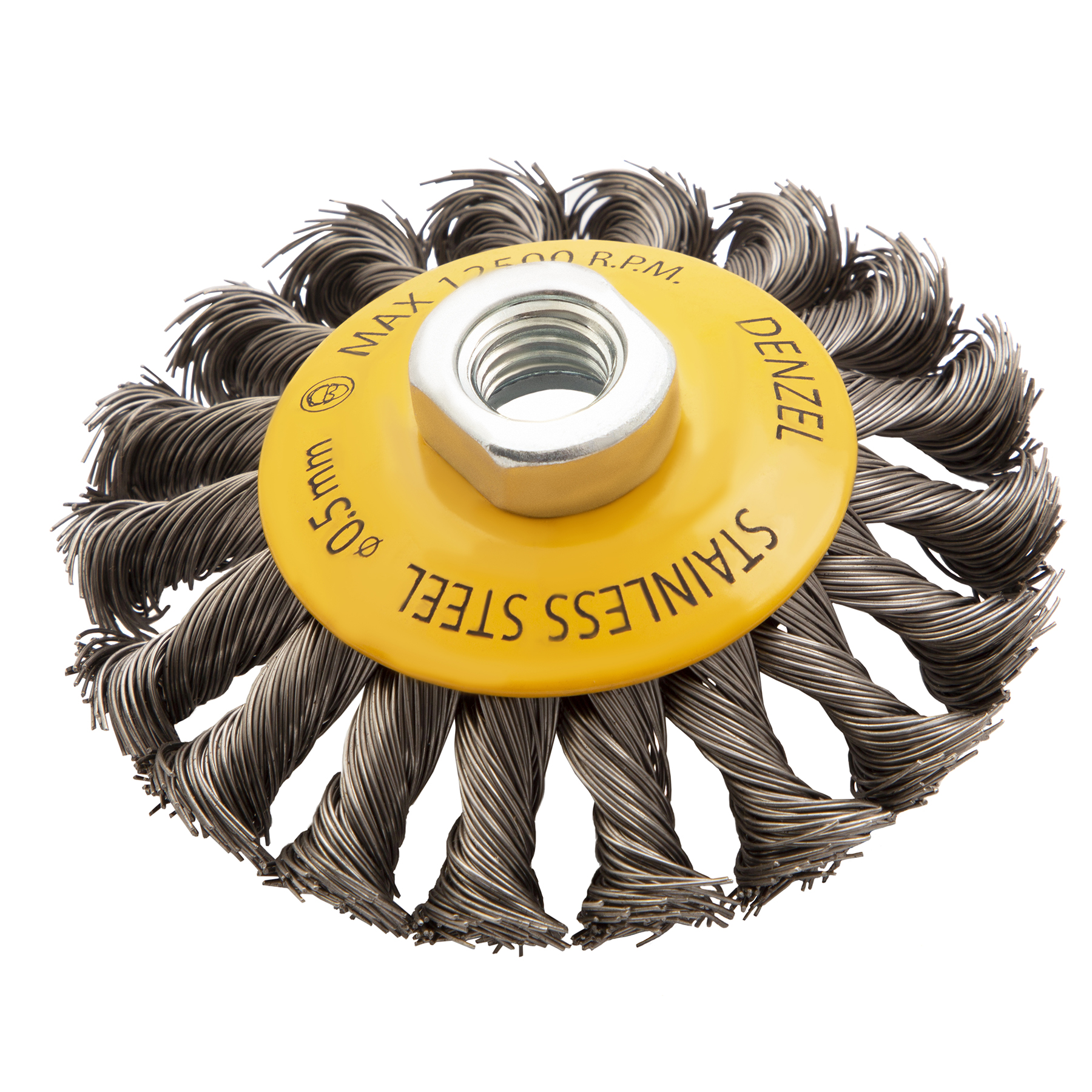 Щетка для УШМ Denzel «Тарелка» 746093, 100 мм, М14, с щетиной из крученой нержавеющей проволоки 0,5 мм, предназначена для снятия толстого слоя краски, лака, ржавчины, для удаления заусенцев и окалины, зачистки сварных швов. Щеткой обрабатывают твердые, преимущественно металлические поверхности, в том числе из нержавеющей стали. Она удобна для очистки как плоских изделий, так и внутренних углов, пазов, изгибов. Щетка совместима с углошлифовальными машинами, поддерживающими работу на скорости до 12500 об/мин. Во время работы необходимо использовать средства индивидуальной защиты. Щетка пригодится во время строительства, на производстве, а также будет полезна в быту.