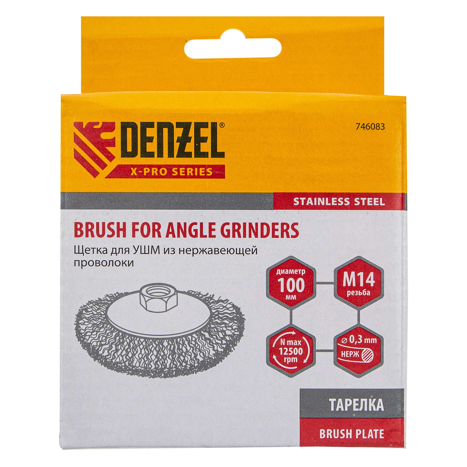 Щетка для УШМ, 100 мм, "Тарелка", витая нержавеющая проволока 0.3 мм, М14 Denzel в Казани