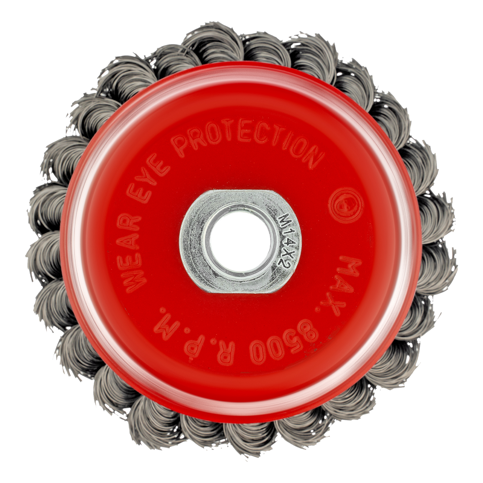 Щетка Matrix «Чашка» 74615 диаметром 100 мм, с присоединительной резьбой М14, с щетиной из крученой проволоки диаметром 0,35 мм, устанавливается на УШМ, поддерживающую работу со скоростью 8500 об/мин. Щетина предназначена для грубой (черновой) обработки поверхностей, менее агрессивной по сравнению с щетиной 0,5 мм. Изделие подходит для удаления загрязнений, снятия толстого слоя ржавчины, ЛКМ, зачистки сварных швов.