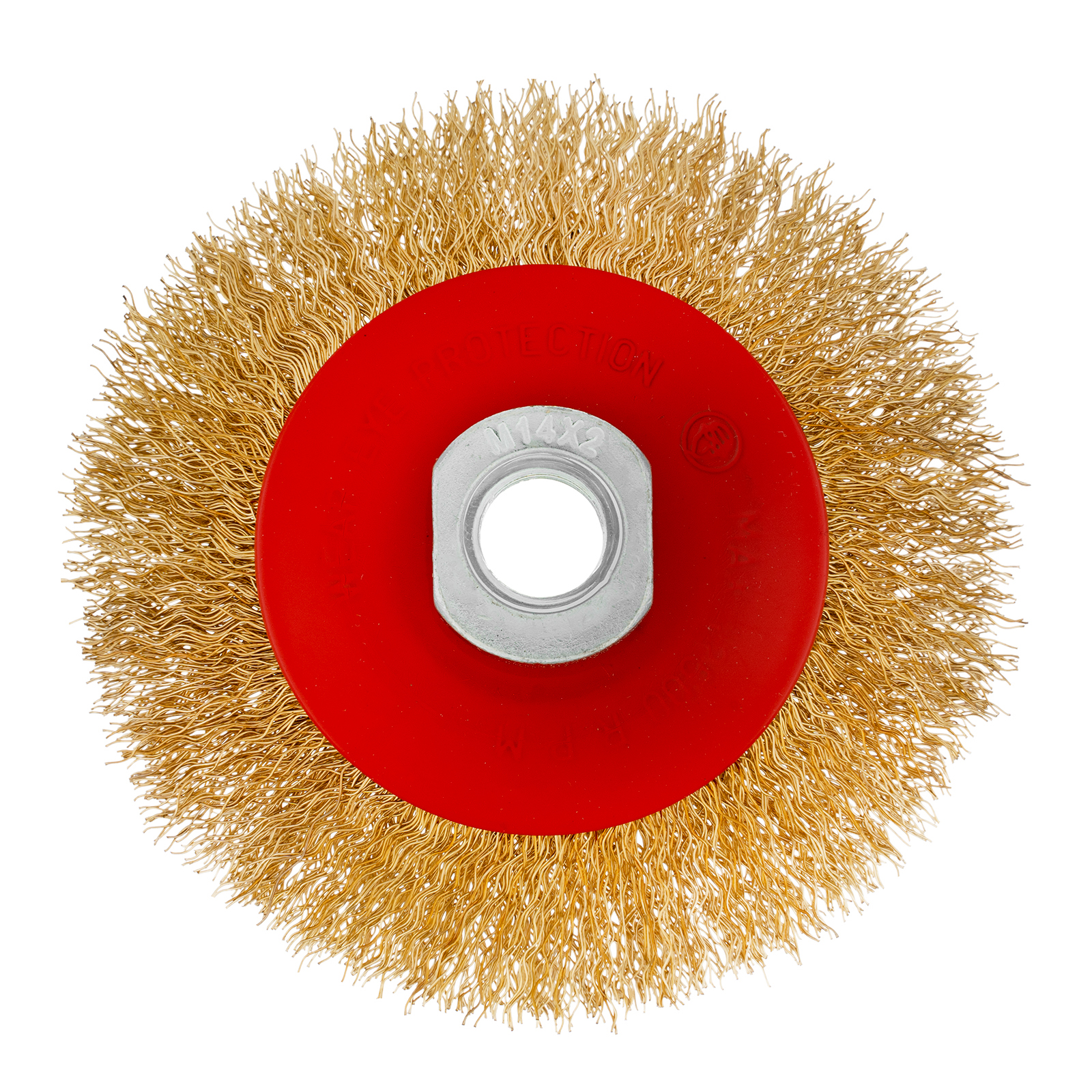 Щетка Matrix «тарелка» 74608 диаметром 100 мм, с щетиной из латунированной витой проволокой и гайкой М14,— насадка для УШМ, использующаяся для удаления с поверхностей ржавчины и загрязнений, старого слоя ЛКМ. Рекомендованная скорость вращения — не более 12500 об/мин. Щетка является универсальным инструментом, позволяющим обрабатывать как большие плоские поверхности, так и углы.