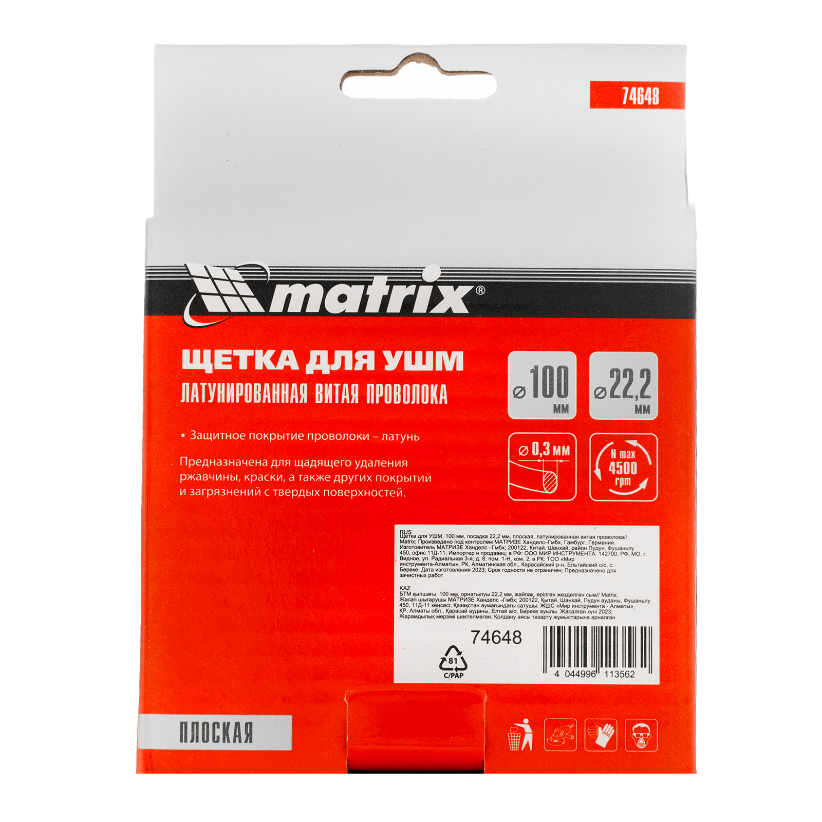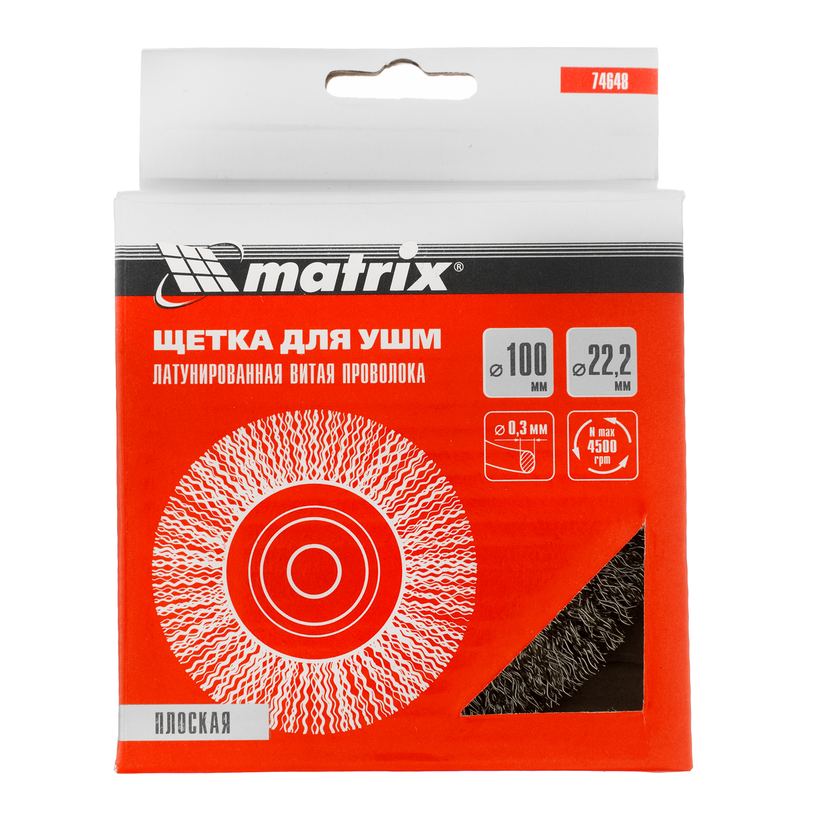 Плоская щетка для УШМ Matrix 74648 диаметром 100 мм, с щетиной из латунированной витой проволоки, посадкой 22,2 мм, предназначена для щадящей обработки поверхностей. Устанавливается на вал УШМ, поддерживающей скорость вращения не более 4500 об/мин. За счет плоской формы эффективно удаляет загрязнения, ржавчину и лакокрасочные покрытия в труднодоступных местах: углах и изгибах.