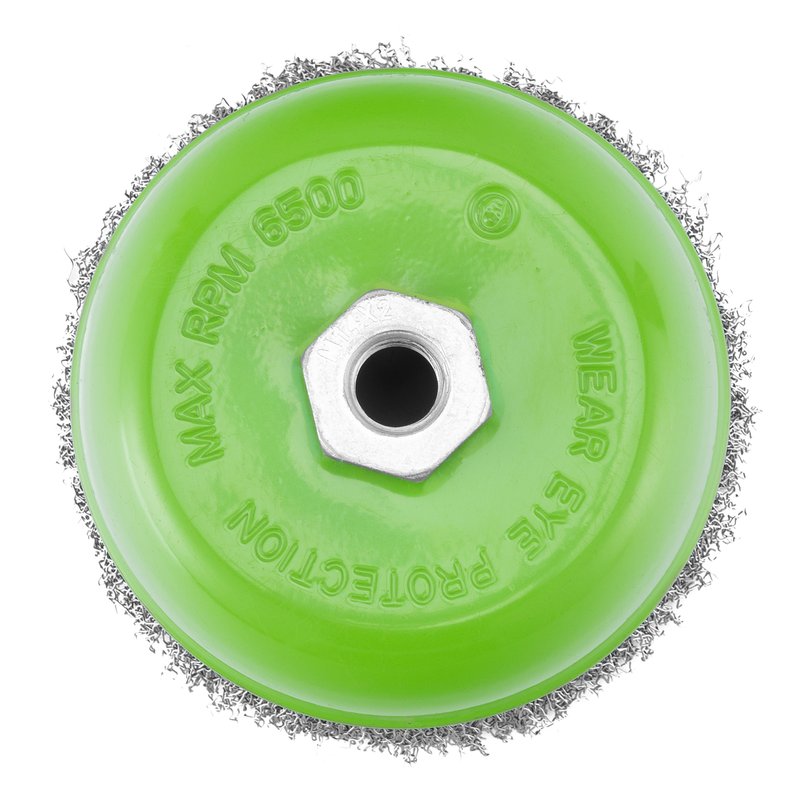 - Быстрая установка и замена насадки — щетка крепится на вал УШМ при помощи гайки М14.