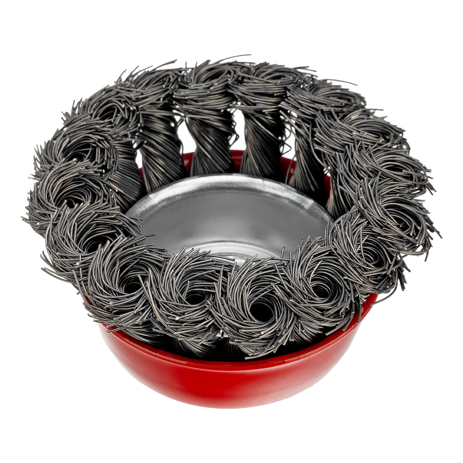 Щетка Matrix «Чашка» 74613 диаметром 65 мм, с присоединительной резьбой М14, с щетиной из крученой проволоки диаметром 0,35 мм, устанавливается на УШМ, поддерживающую работу со скоростью 12500 об/мин. Щетина предназначена для грубой (черновой) обработки поверхностей, менее агрессивной по сравнению с щетиной 0,5 мм. Изделие подходит для удаления загрязнений, снятия толстого слоя ржавчины, ЛКМ, зачистки сварных швов.