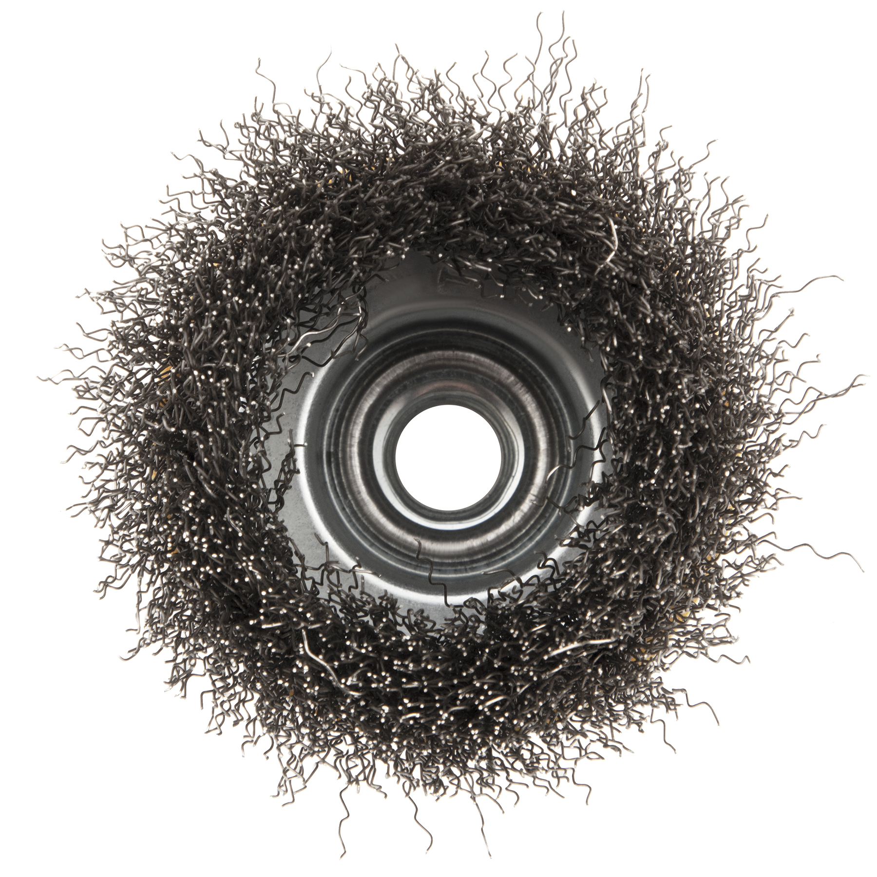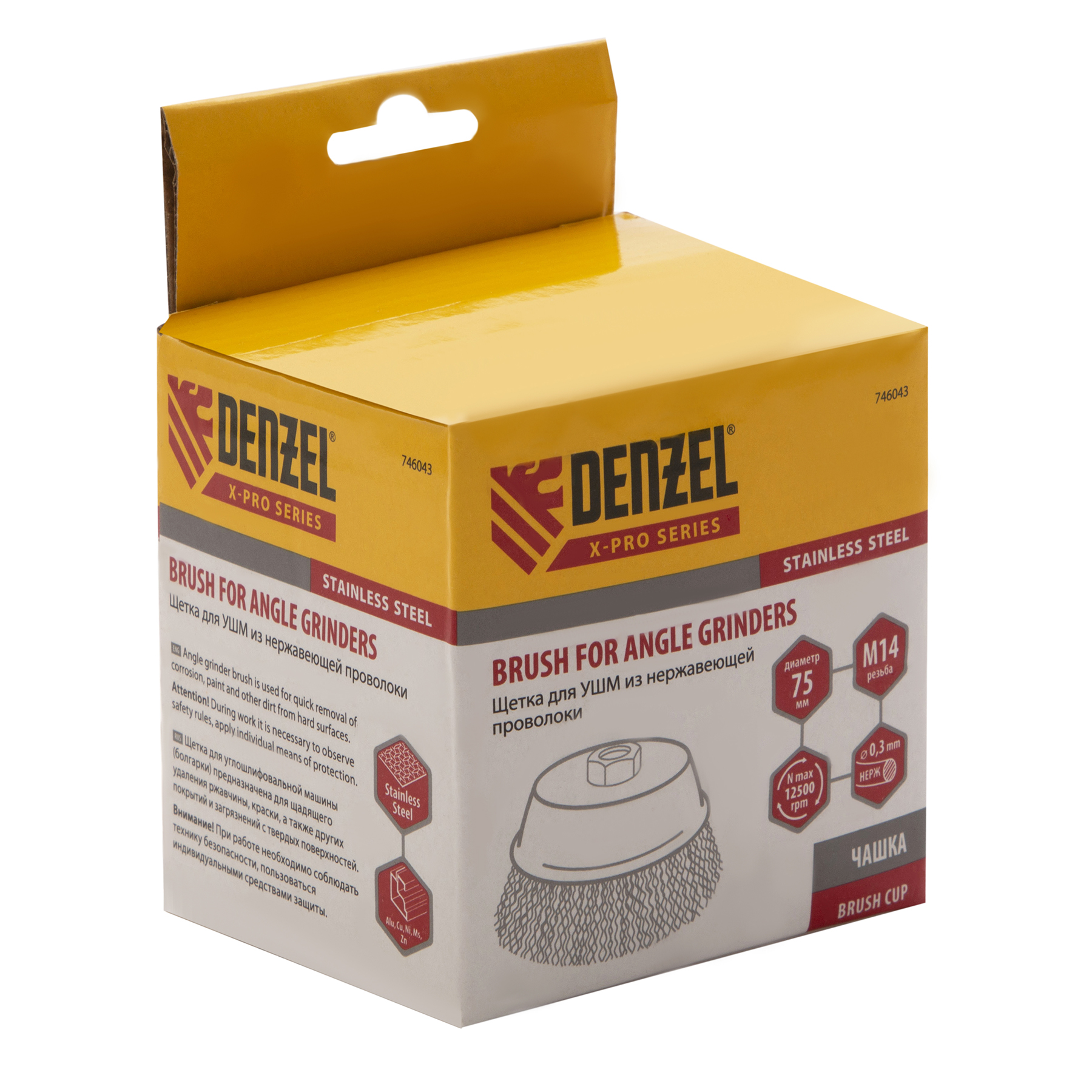 Щетка для УШМ «Чашка» Denzel 746043 с гайкой М14, диаметром 75 мм, с щетиной из витой нержавеющей проволоки диаметром 0,3 мм, позволяет быстро и аккуратно очистить металлическую, деревянную или пластиковую поверхность от незначительных загрязнений и ржавчины, а также удалить остатки лакокрасочных материалов, сделать поверхность шероховатой или матовой. Насадка предназначена для очистки плоских участков большой площади. Подходит для обработки нержавеющей стали.