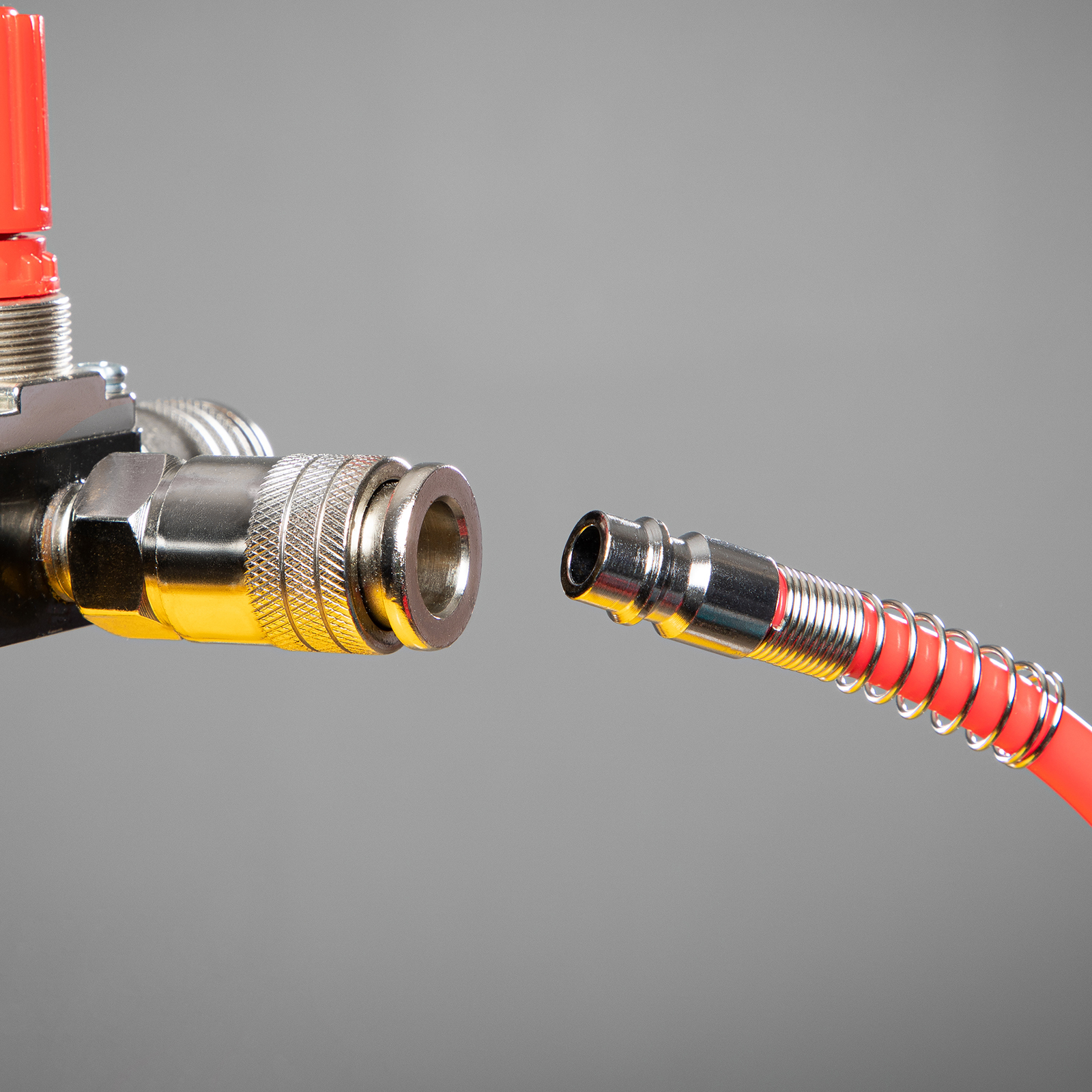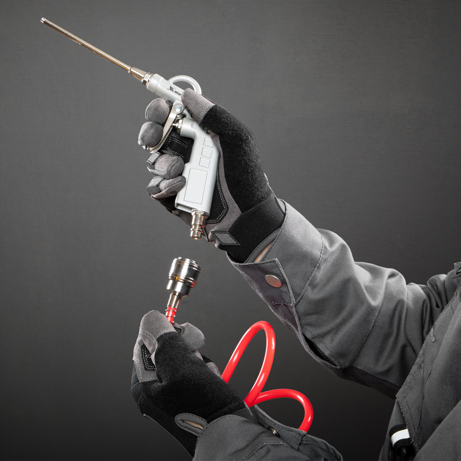 - Быстроразъемное соединение ускоряет подключение пневмоинструментов, что экономит время и силы мастера.