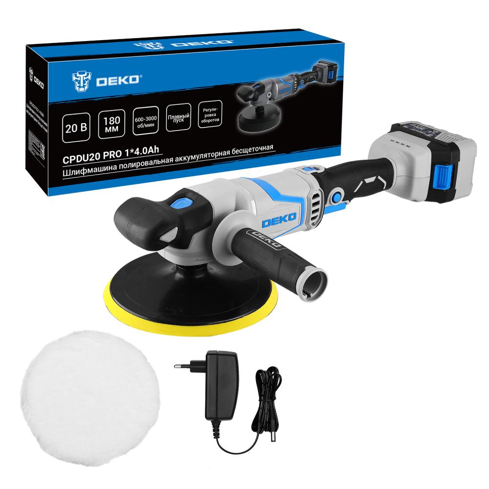 Шлифмашина полировальная аккумуляторная DEKO CPDU20 PRO 1*4.0Ah обеспечивает качественную полировку и шлифовку различных лакокрасочных, полимерных и прочих покрытий.Технические характеристики:Емкость АКБ: 4000 мАчЧисло оборотов: 600-3000 об/минДиаметр опорной тарелки: 180 ммРезьба шпинделя: М14Кол-во скоростей: 6Регулировка оборотов: даШлифмашина поставляется в частично разобранном виде:Шлифмашина – 1 штОпорная тарелка 180 мм - 1 штДополнительная рукоятка – 1 штВ комплекте:АКБ – 1 штЗарядное устройство – 1 штПолировальный круг (шерстяной) – 1 штРуководство по эксплуатации – 1 штПоставляется в картонной коробке.