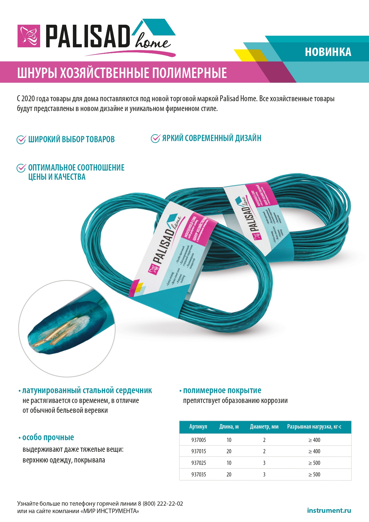 - Защита от коррозии — благодаря полипропиленовому покрытию шнур не ржавеет и не пачкает одежду.